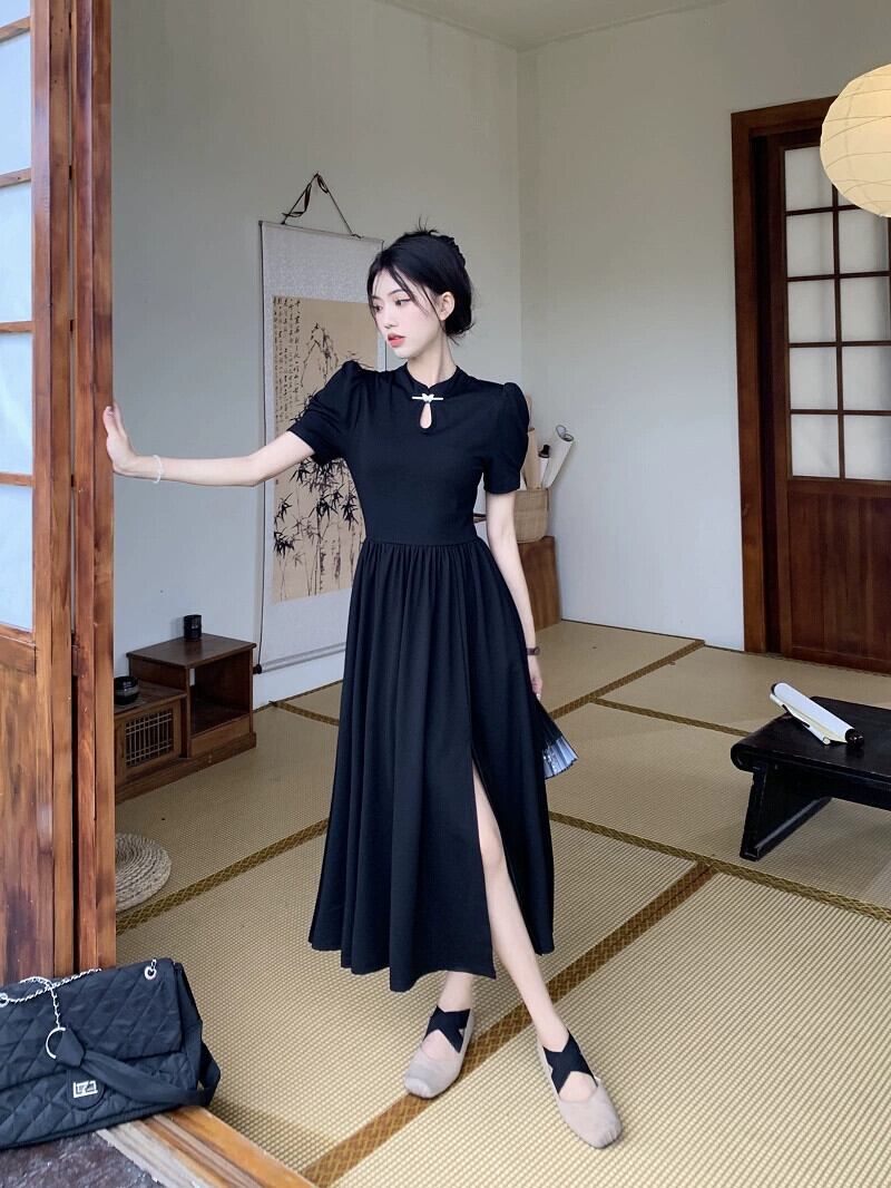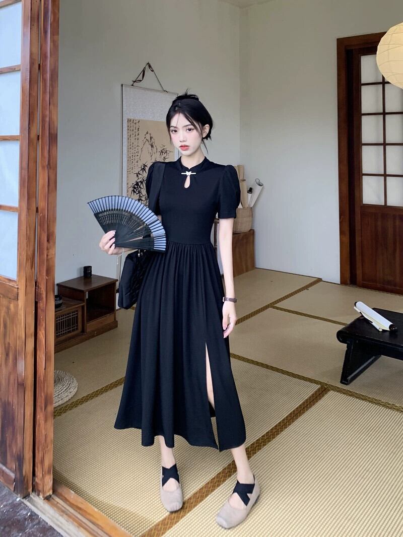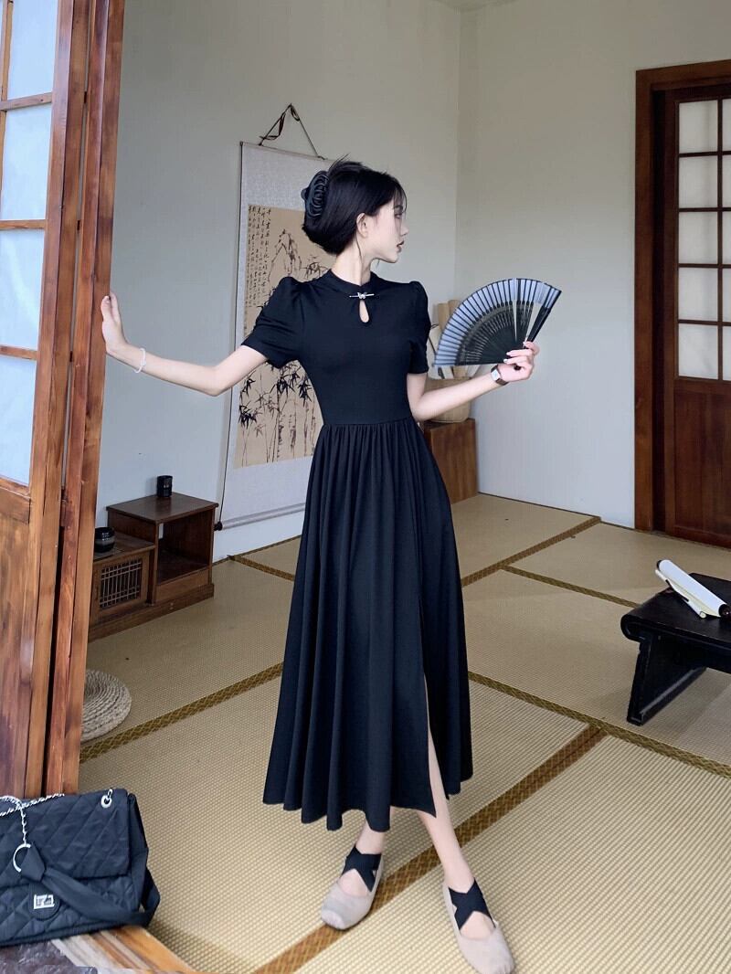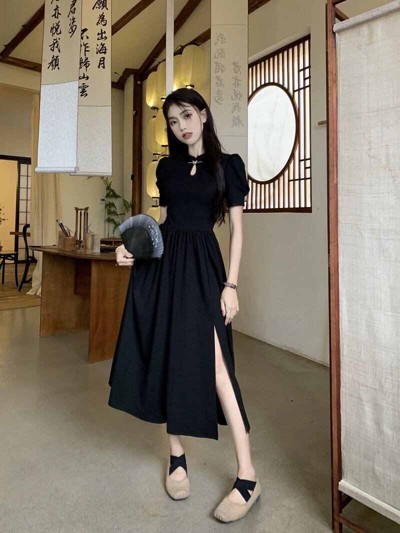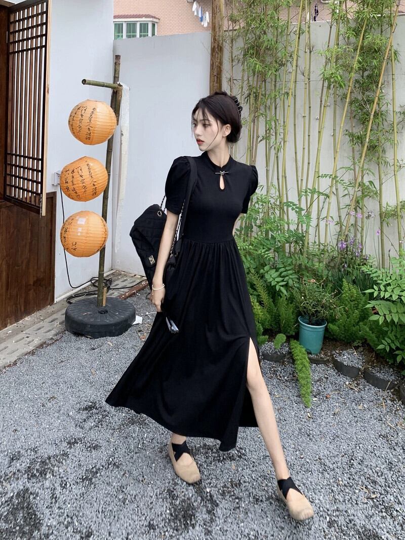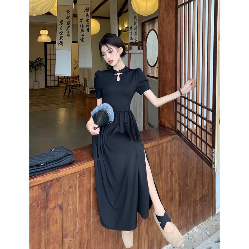 中国風の改良されたチャイナドレス夏の新しい気質黒の大きなスイングスリットミッドレングススカートイン女性 ブラック サマー 夏物 missk10919275555