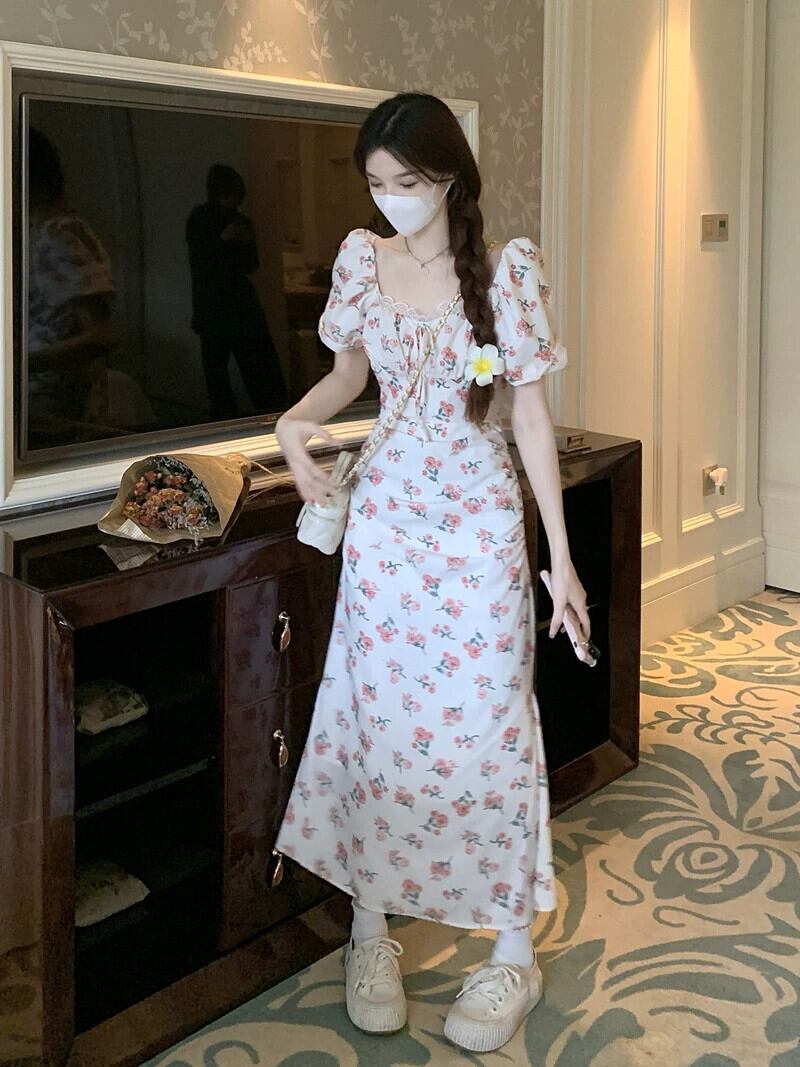 フランスの花柄ドレスの女性の 2023 夏の新しいデザインセンス背中の開いたネクタイウエスト痩身半袖ティーブレイクスカート サマー 夏物 missk99923861388