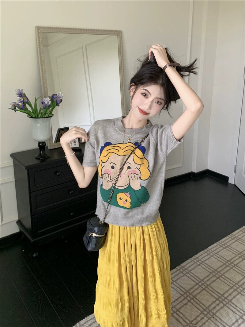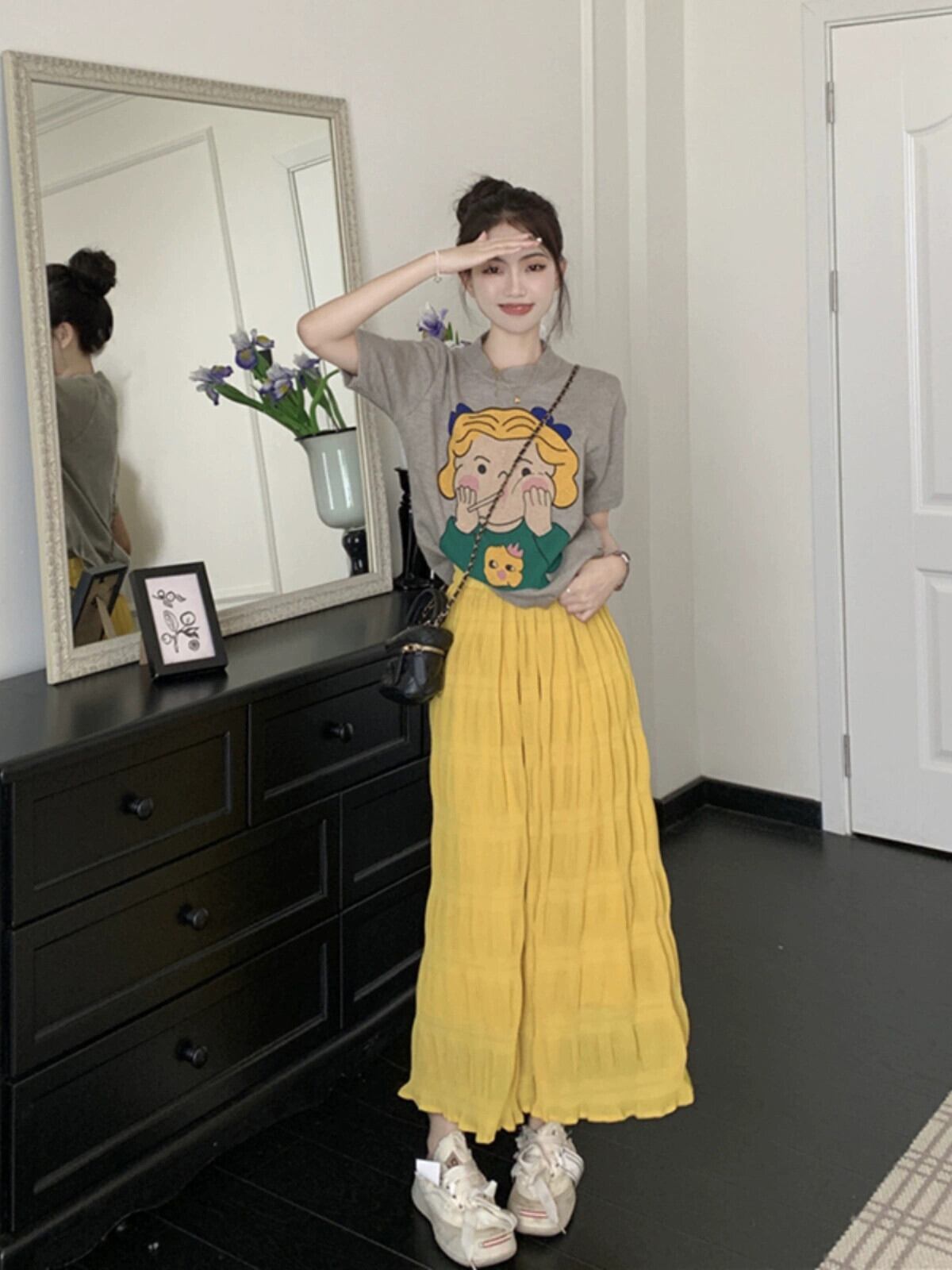 漫画のプリントニット半袖 Tシャツハイウエスト黄色ミッドレングススカート女性の夏の新しいファッションツーピーススーツ ハイウェスト サマー 夏物 missk37224117013