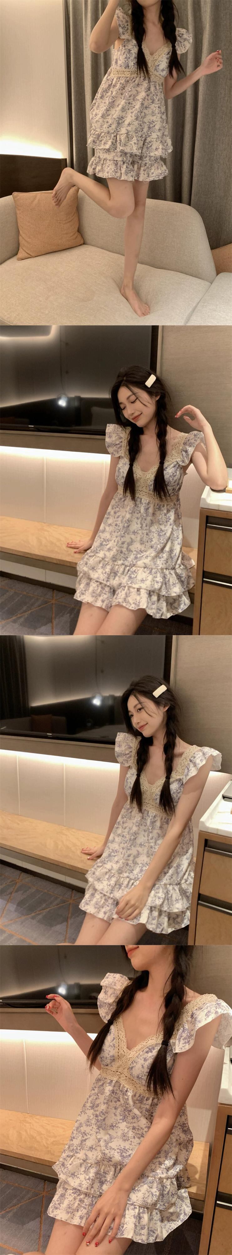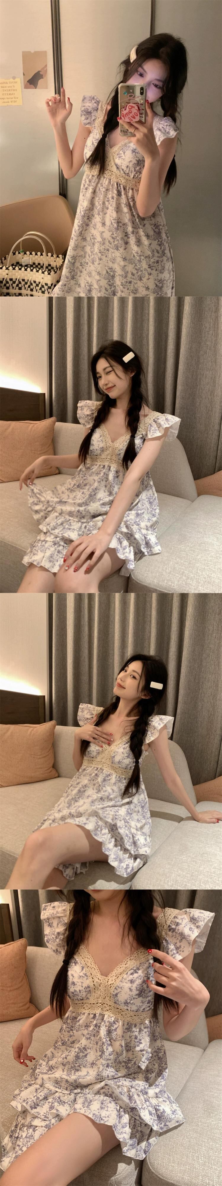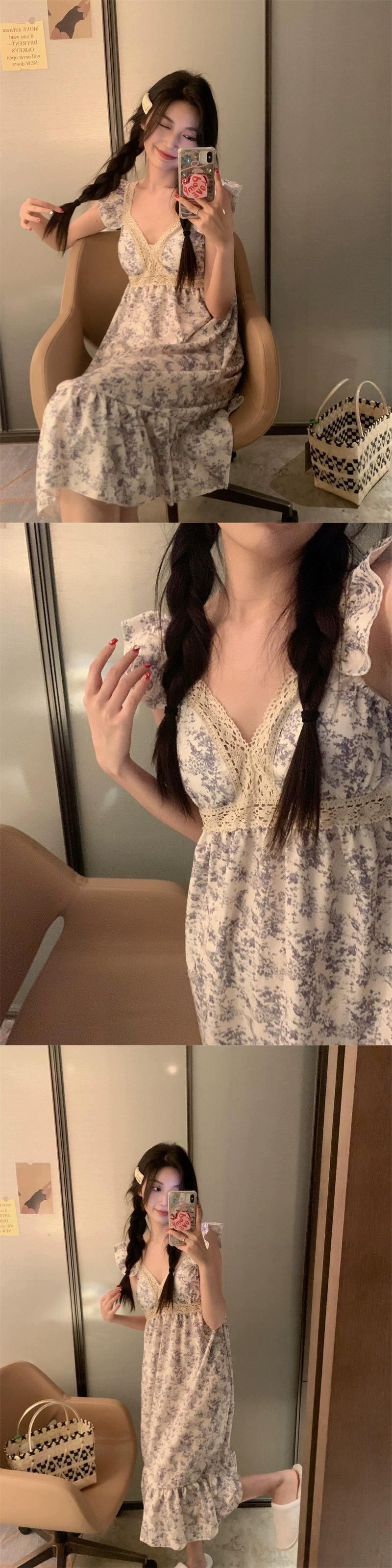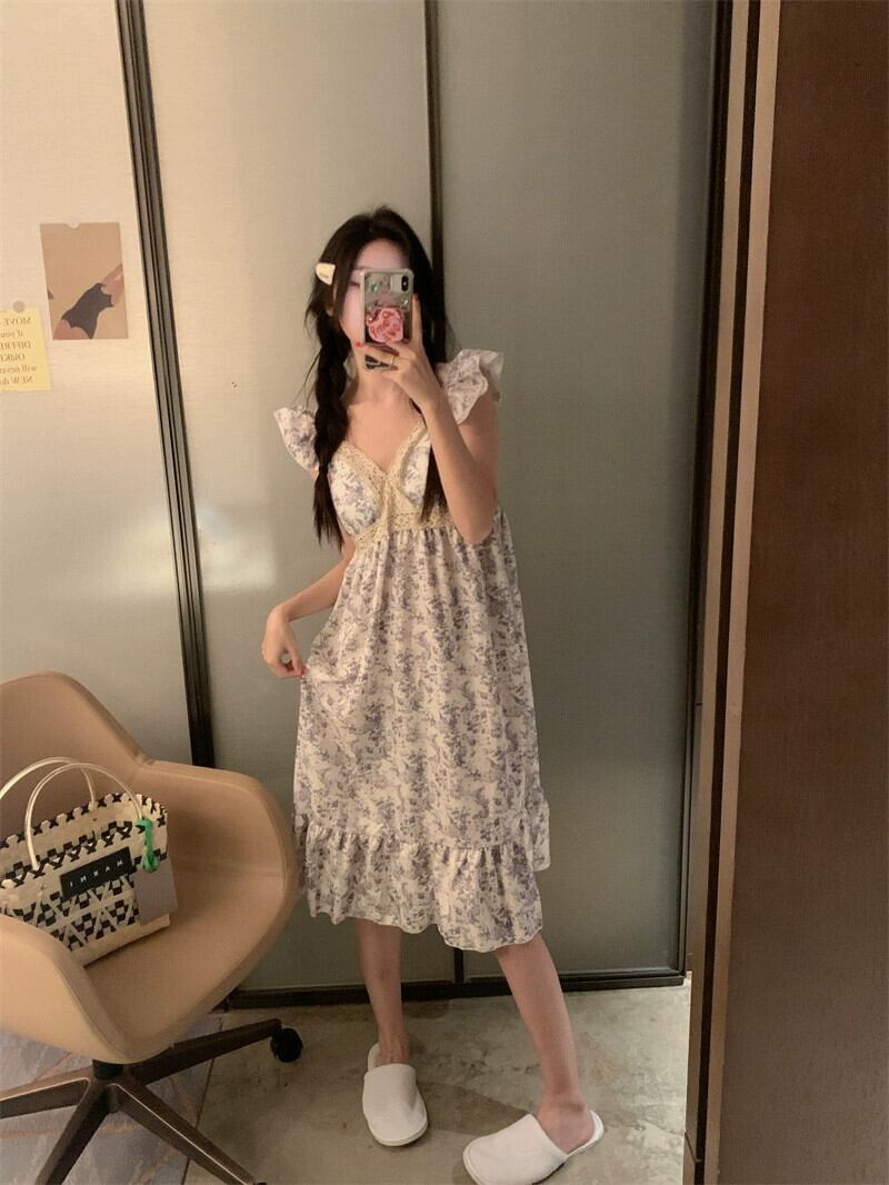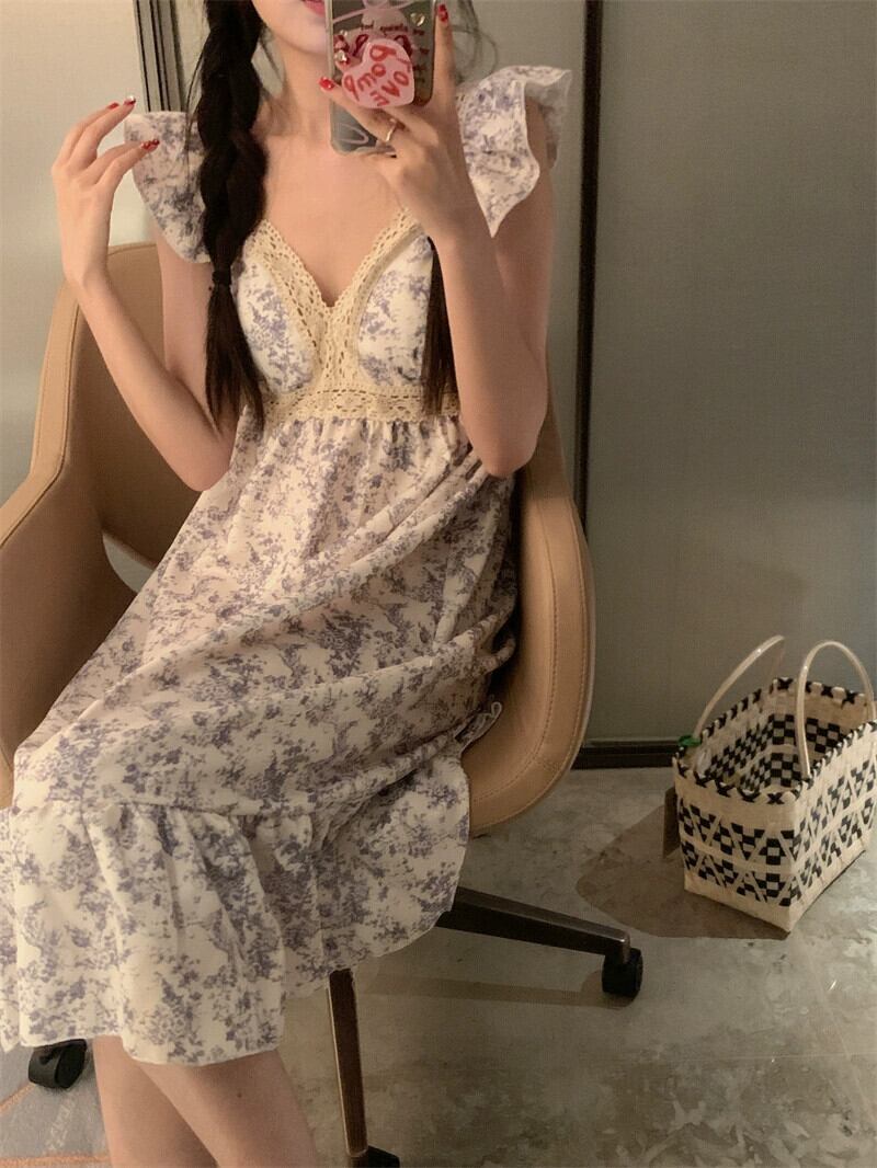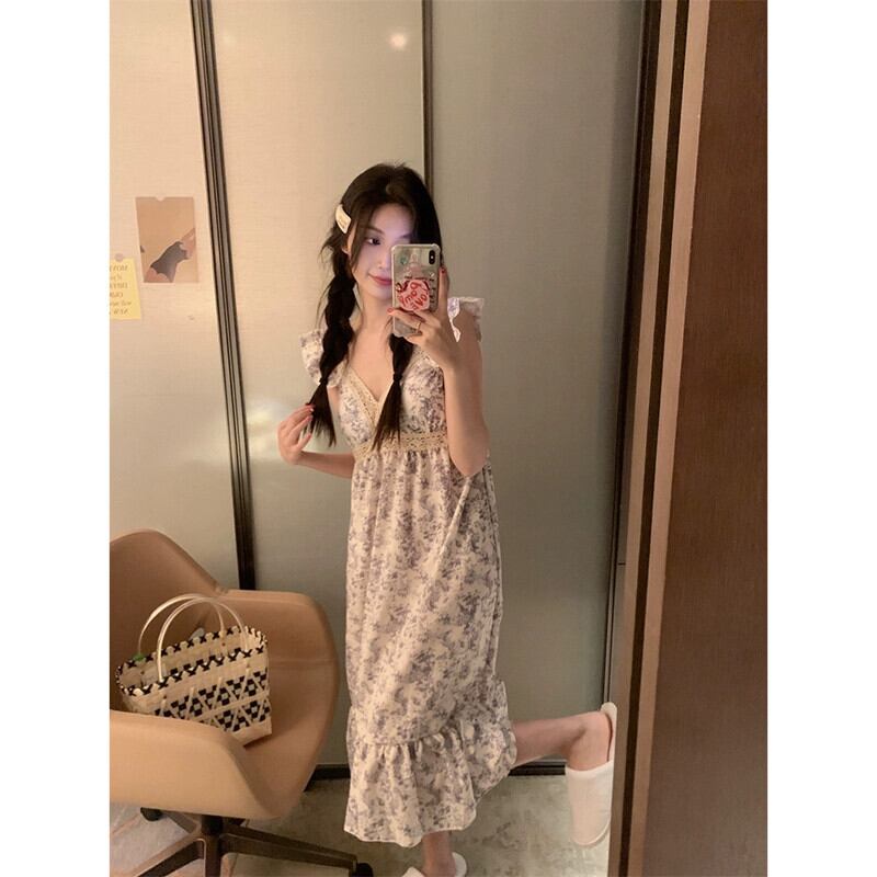 小さなフライングスリーブレース V ネックドレス女性の夏の 2023 新しいウエスト痩身は花の寝間着の外で着用できます サマー 夏物 花柄 Vネック missk97698939570