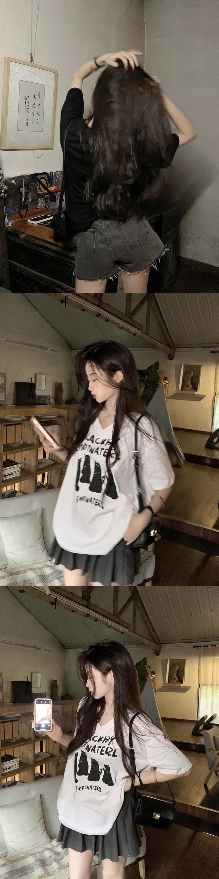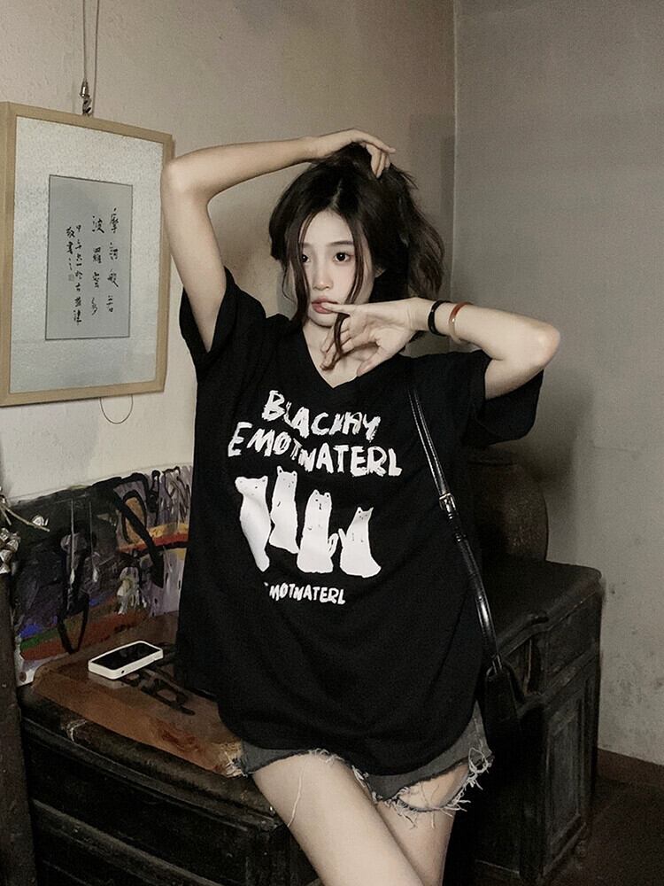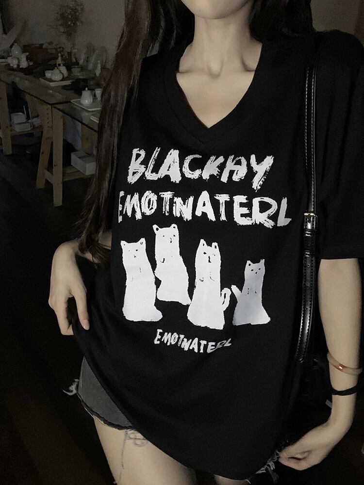 Vネックコットン半袖Tシャツレディース2023年夏新作楽しい猫プリントルーズブラックトップイン サマー 夏物 missk1718114057