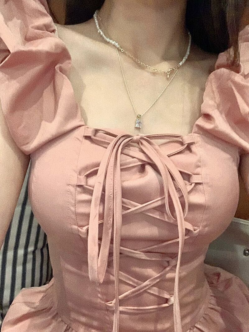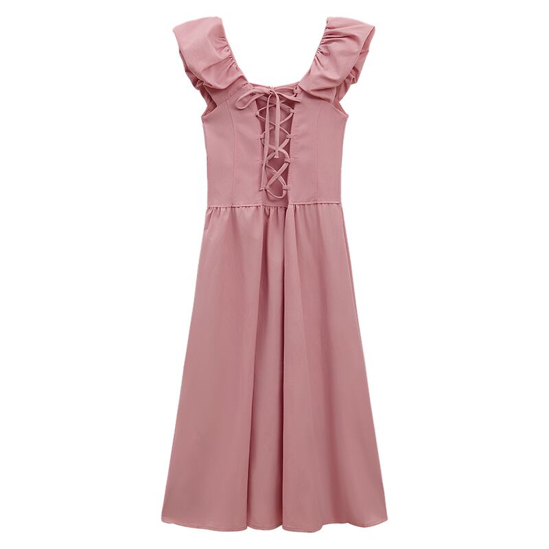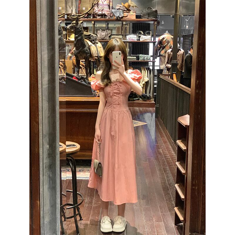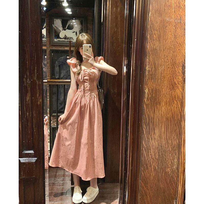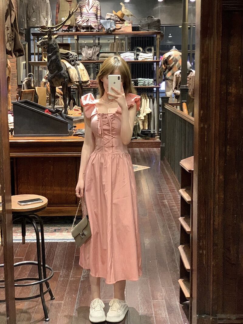 優しいフライング スリーブ ドレス 夏ガーリー ピンク スリム スクエア ネクタイ A ライン スカート イン サマー 夏物 Aライン スクウェア missk33946325648