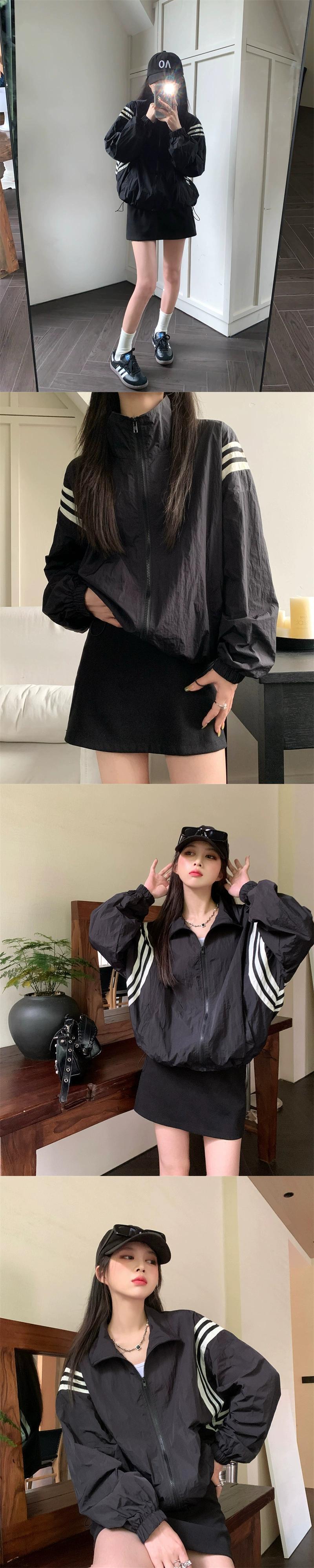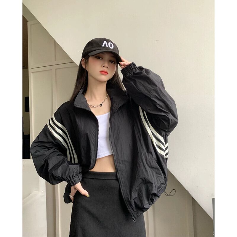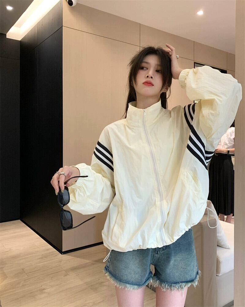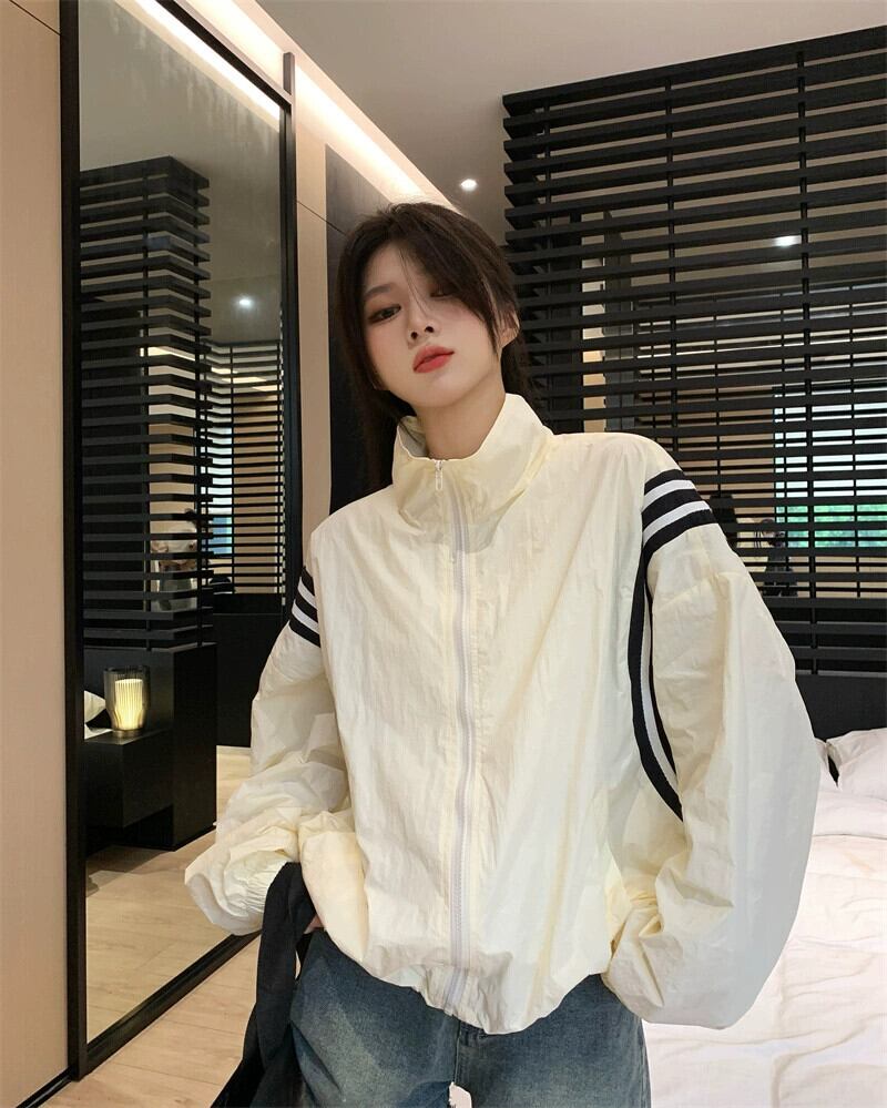 スポーツスタイル日焼け止めジャケット女性の 2023 春新色コントラストスタンドアップカラー巾着緩い学生長袖ジャケット潮 ロング スプリング 春物 missk52562563923