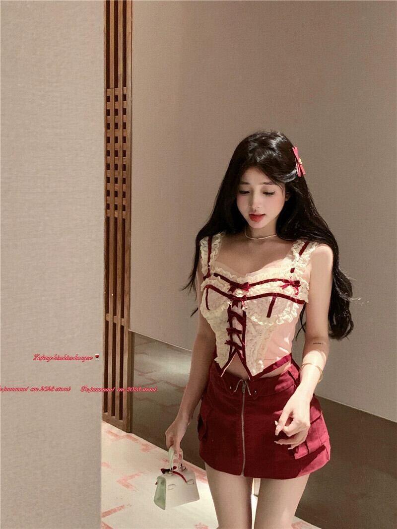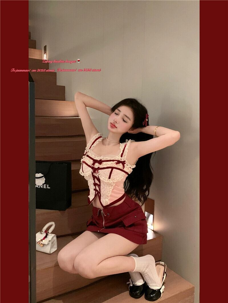 フランスの純粋な欲望スタイルのスーツ女性のシックなレースのサスペンダートップ夏の新しいツーリングスカート甘くてスパイシーなショートスカート 大人ガーリー スウィート キュート カジュアル サマー 夏物 ピュア missk832449537