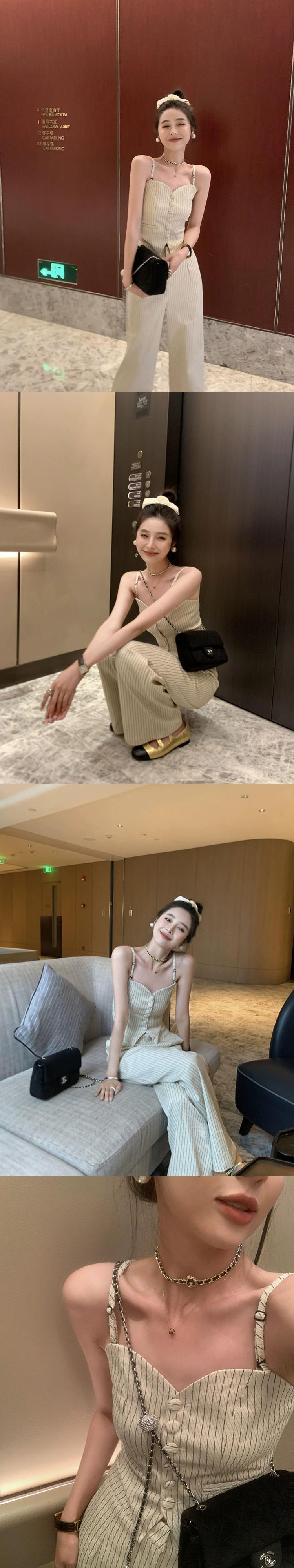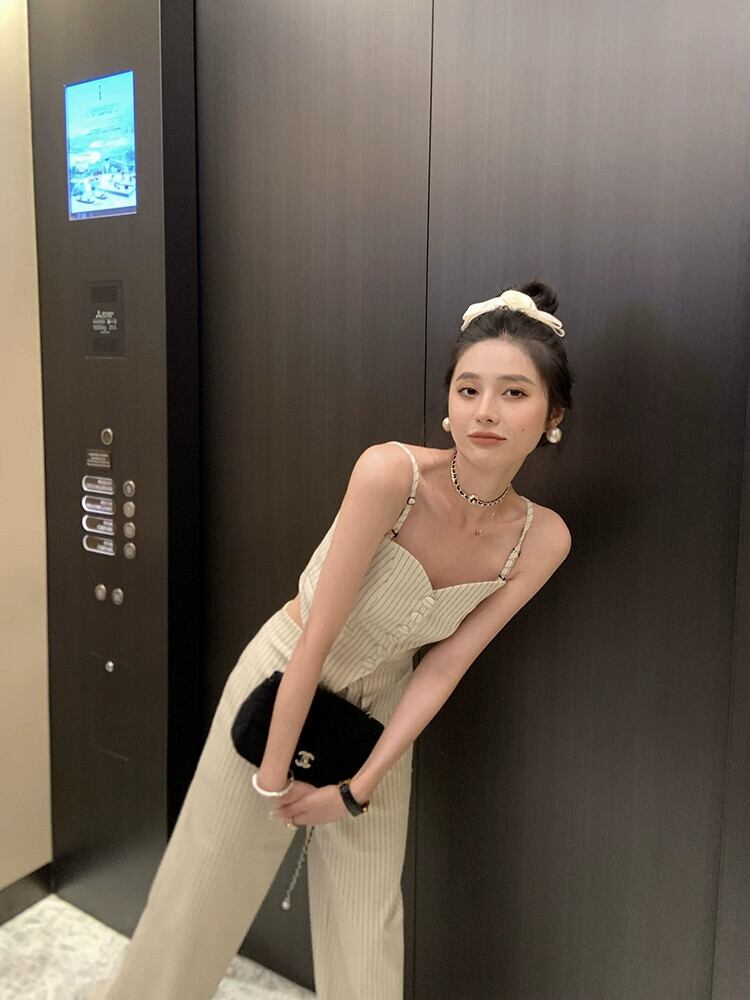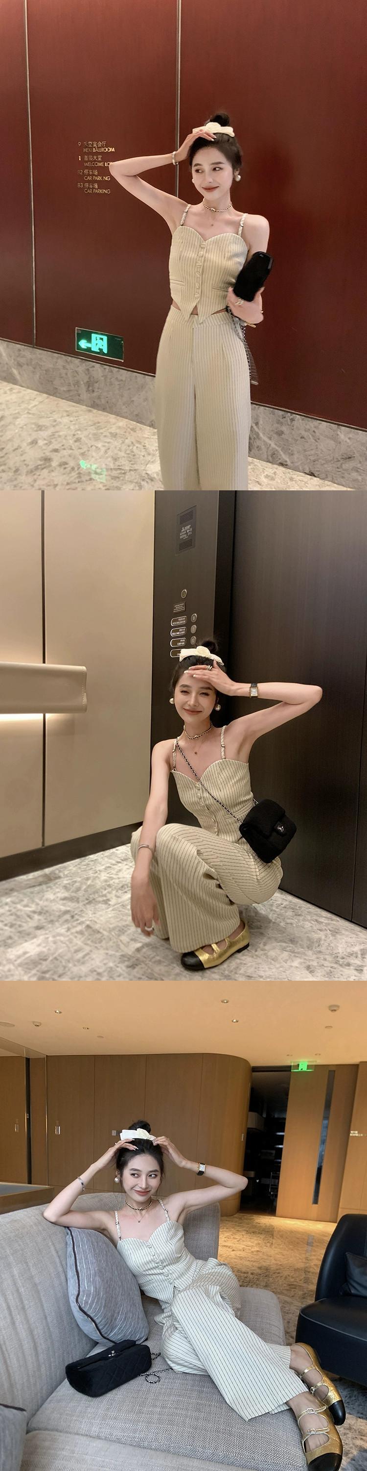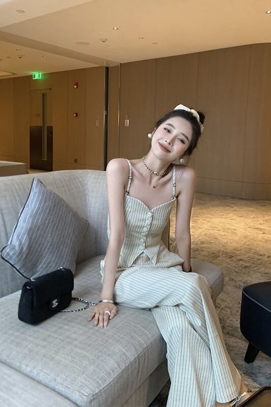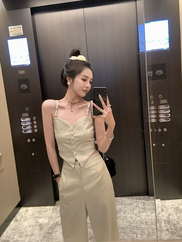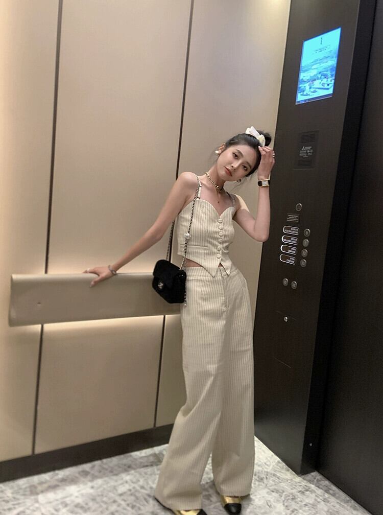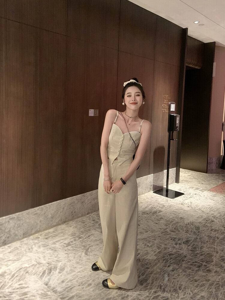 レトロネットレッドスリムスリムストライプキャミソールワイドレッグパンツ女性の夏の 2023 新しいファッション 2 点セット サマー 夏物 missk99891438440