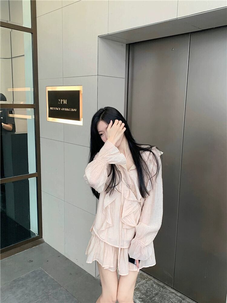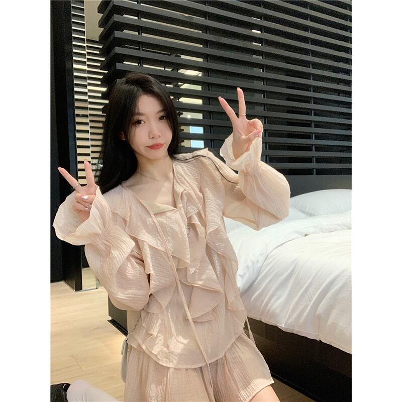 優しい風フリル V ネック長袖シフォンシャツケーキスカート女性の夏の 2023 新しいファッションスーツ ロング サマー 夏物 Vネック missk64187260607