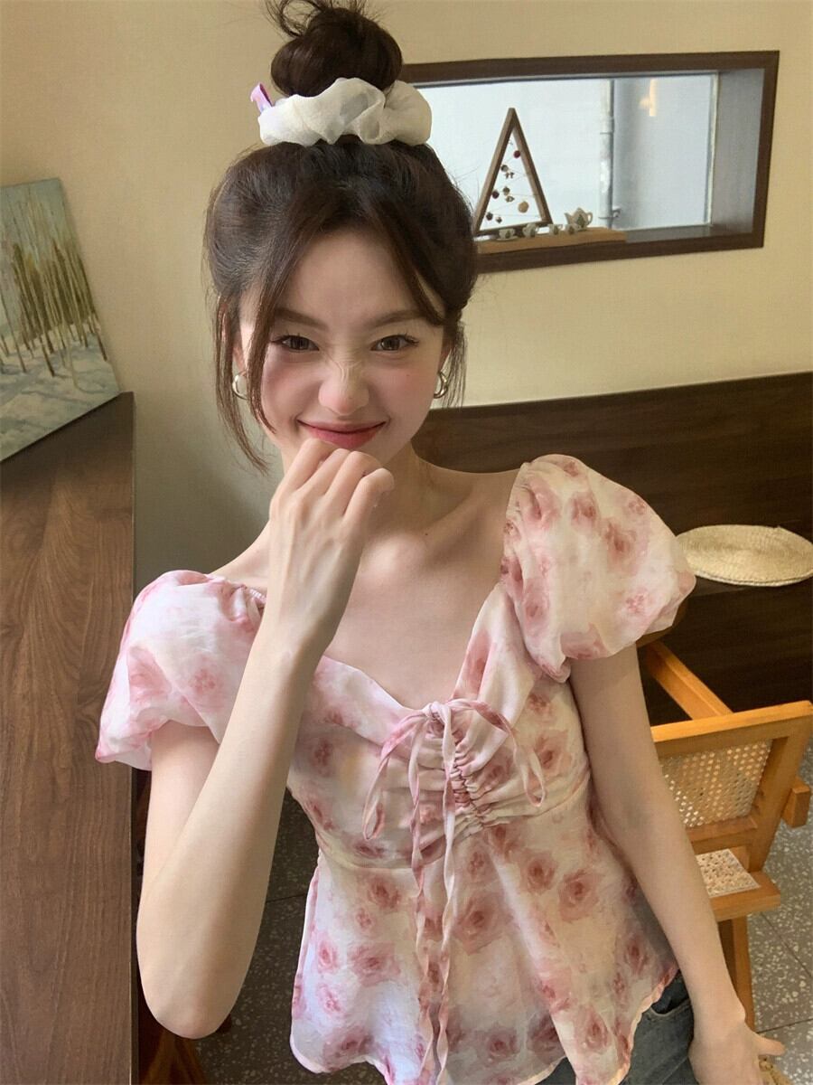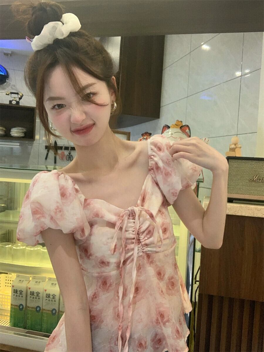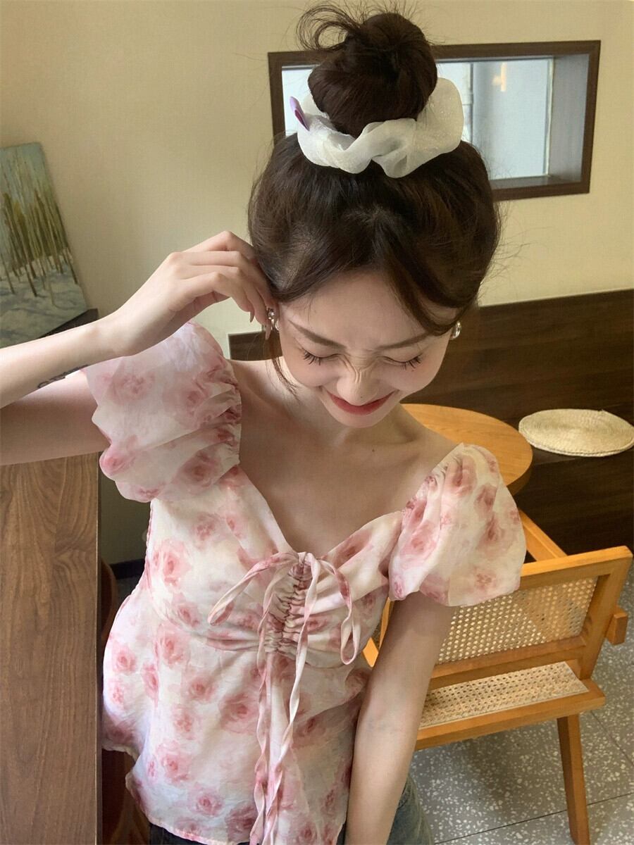 甘い泡半袖シフォンシャツ夏小さな新鮮な新しい花の気質Vネックトップシックな潮流 大人ガーリー スウィート キュート カジュアル サマー 夏物 花柄 missk49207035228