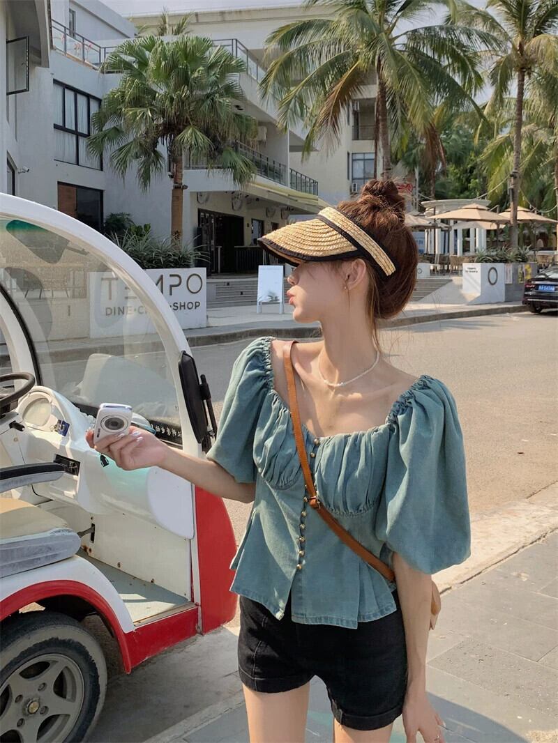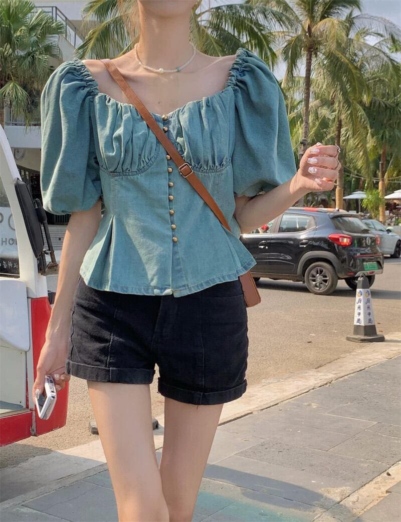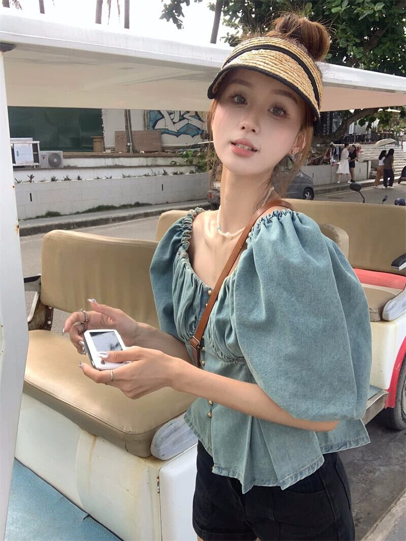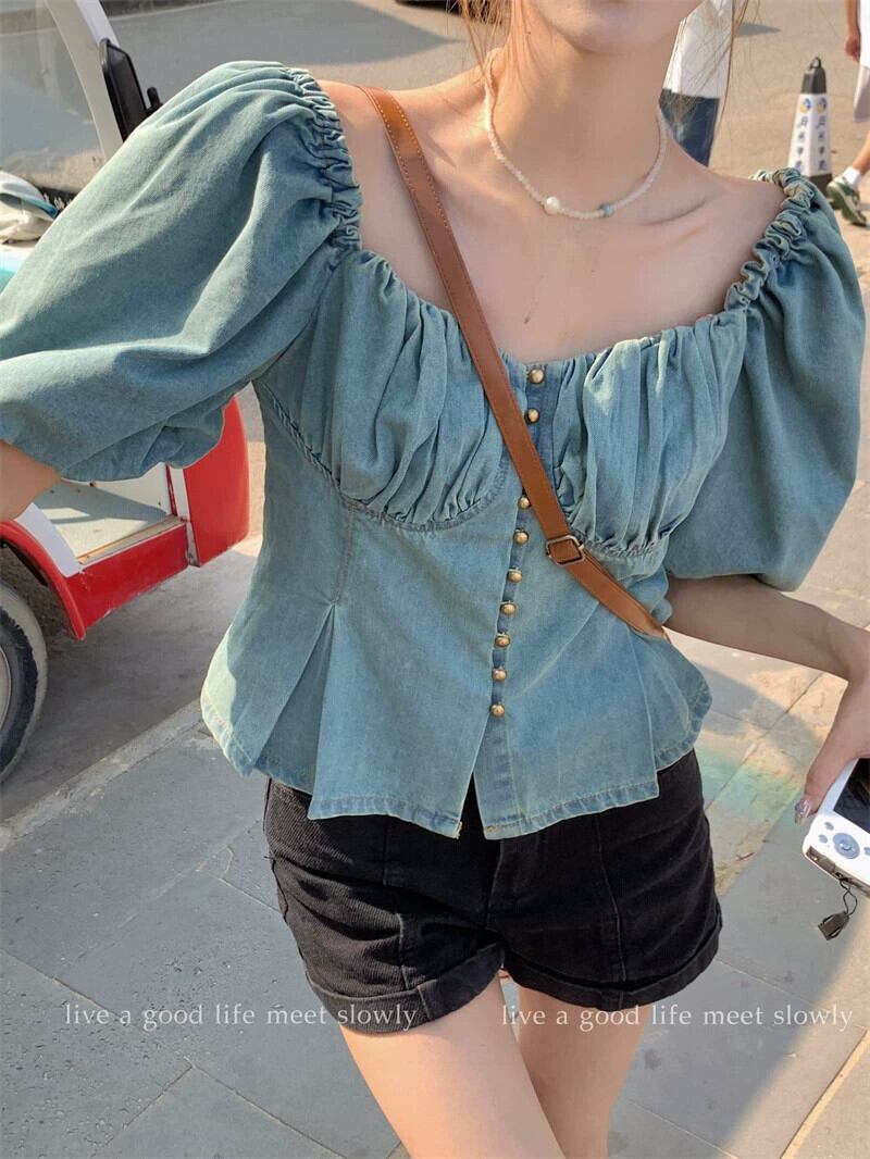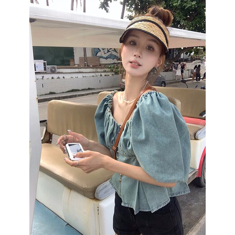 スクエアカラー鎖骨半袖デニムシャツレディース2023年夏新デザインセンスフレンチニッチ痩身プリーツトップ サマー 夏物 スクウェア missk44910785296