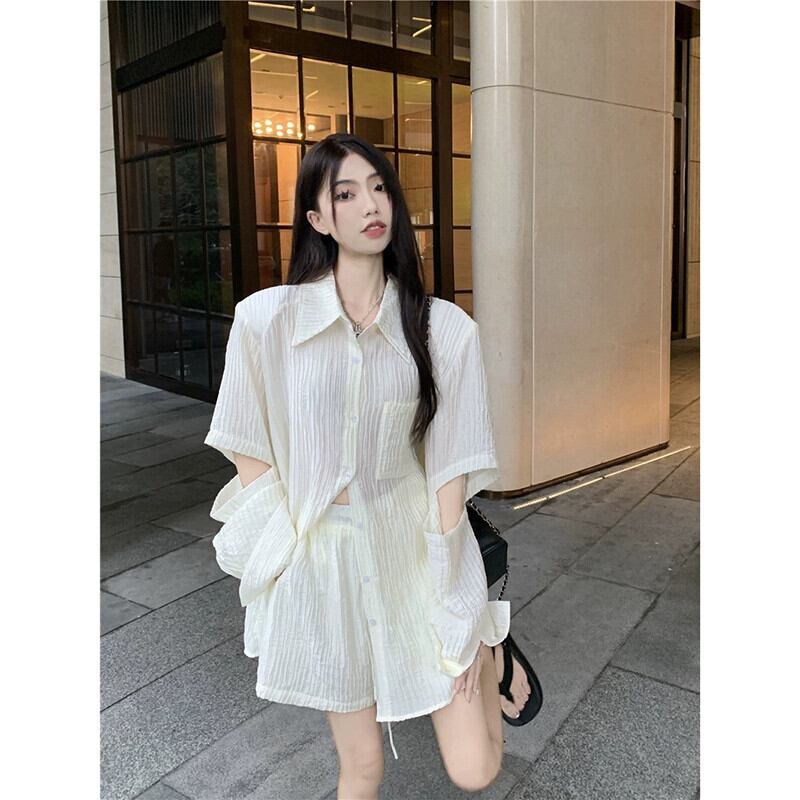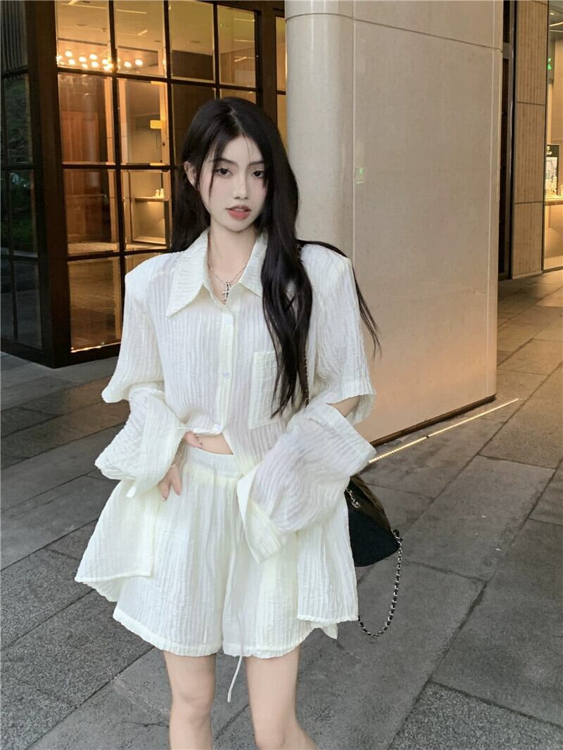 薄セクションプリーツデザインセンス長袖日焼け止めシャツハイウエストワイドレッグショーツレディース2023夏の新しいファッション2点セット ハイウェスト ロング サマー 夏物 ブルマー missk16644922663
