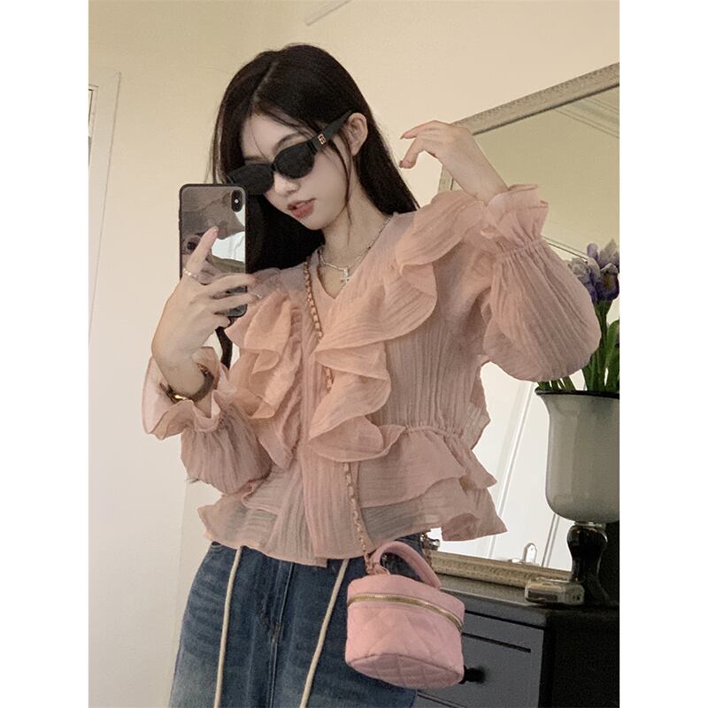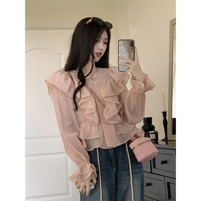 フリル V ネック長袖シフォンシャツ女性の 2023 夏の新しい甘いフレンチニッチデザインセンスシックな小さなシャツ ロング 大人ガーリー スウィート キュート カジュアル サマー 夏物 Vネック missk66037749538