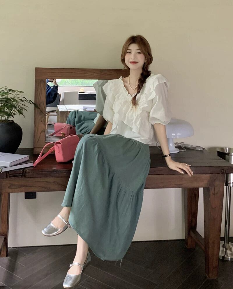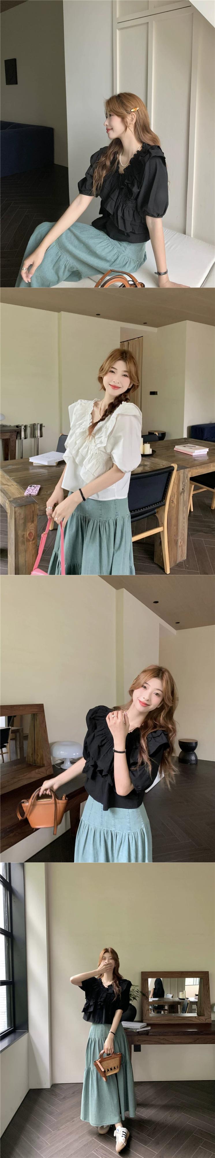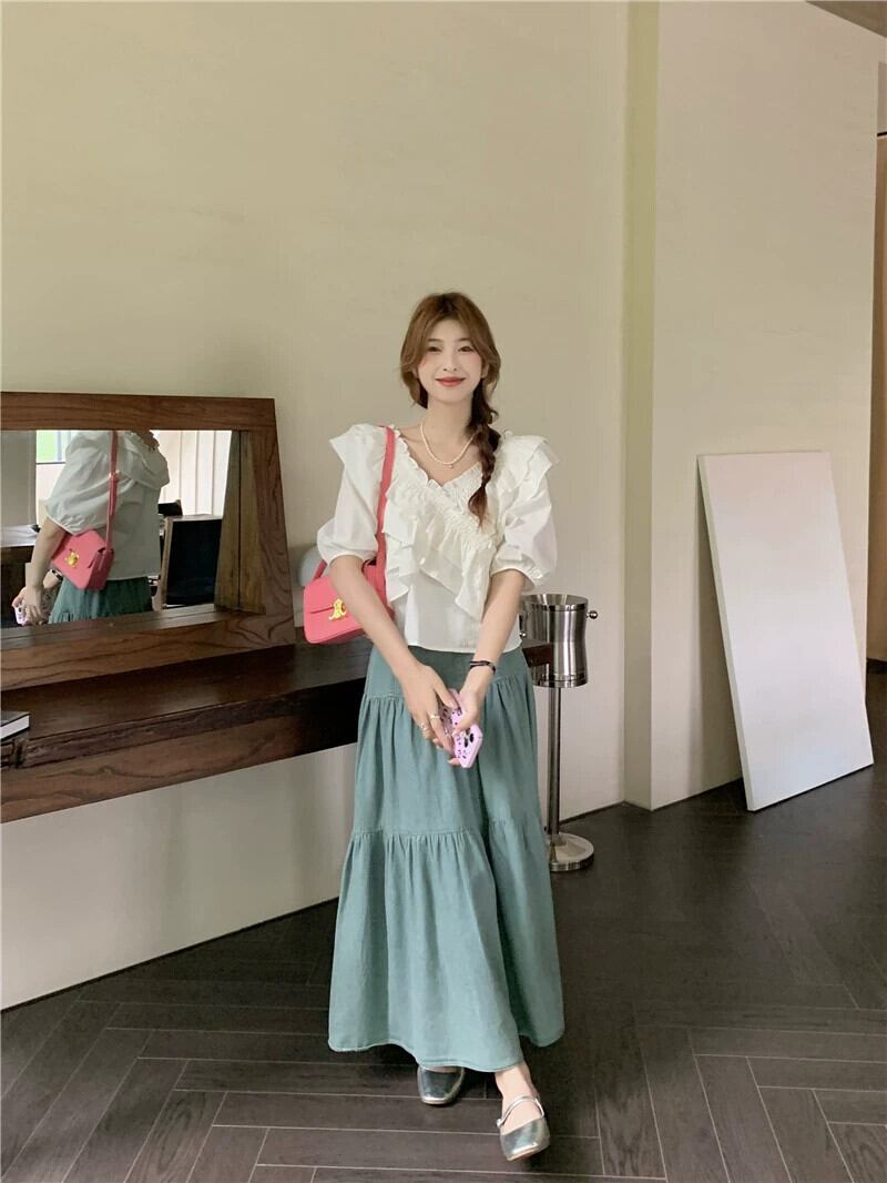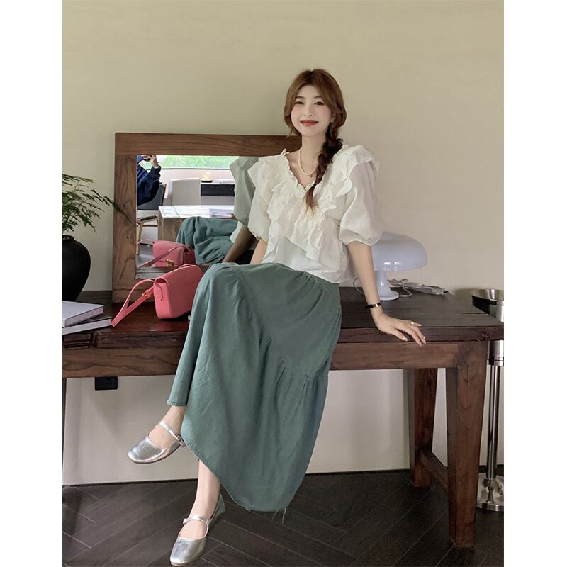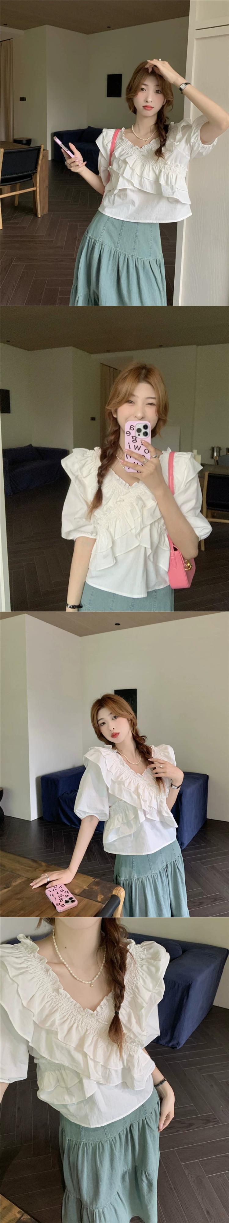 フリル V ネック シャツ レディース 2023 夏の新作優しい風フレンチ ニッチ ホワイト ショート パフ スリーブ トップ サマー 夏物 Vネック missk253231864