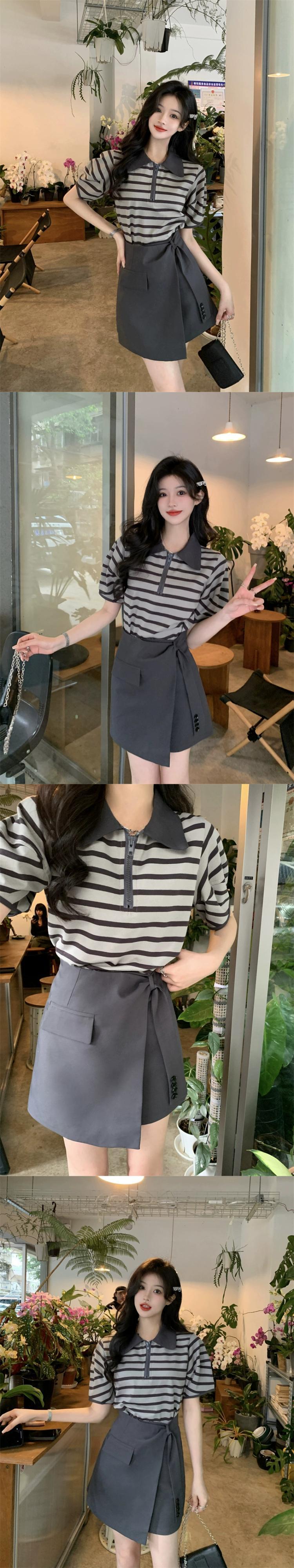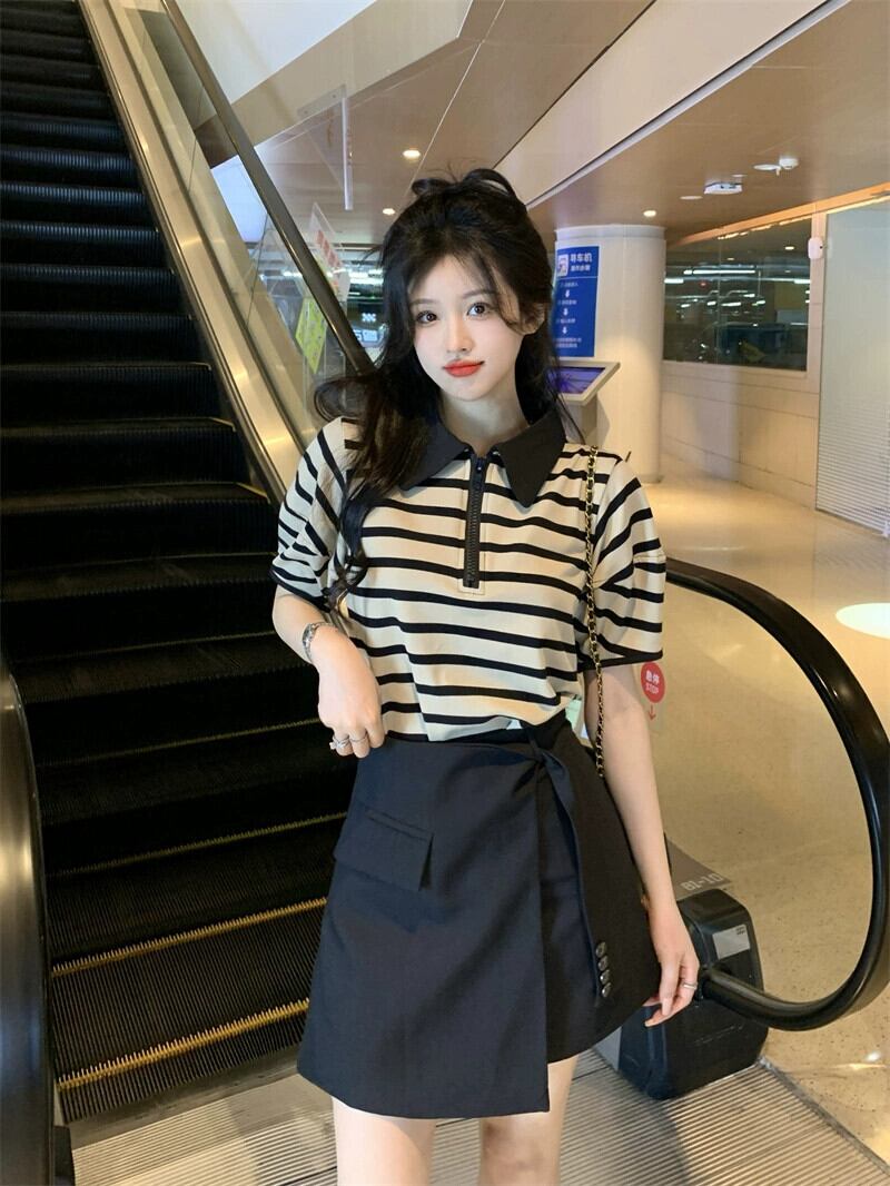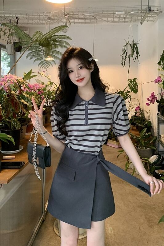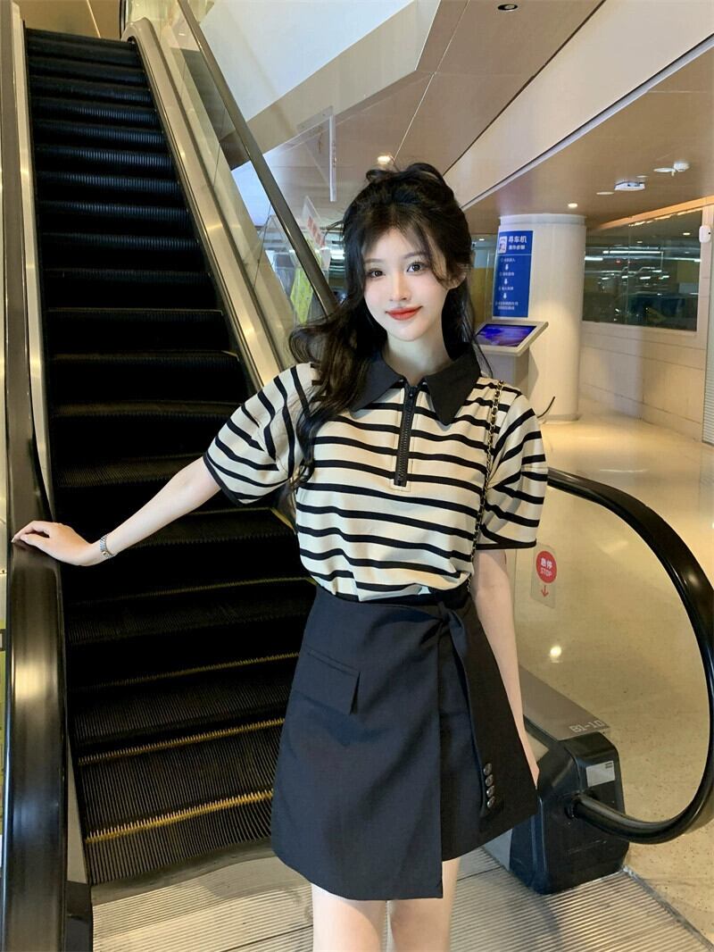 ポロ襟ストライプ半袖 Tシャツデザインセンスハイウエストスーツスカート女性の夏の 2023 新しいファッションスーツ ハイウェスト サマー 夏物 missk78182595504