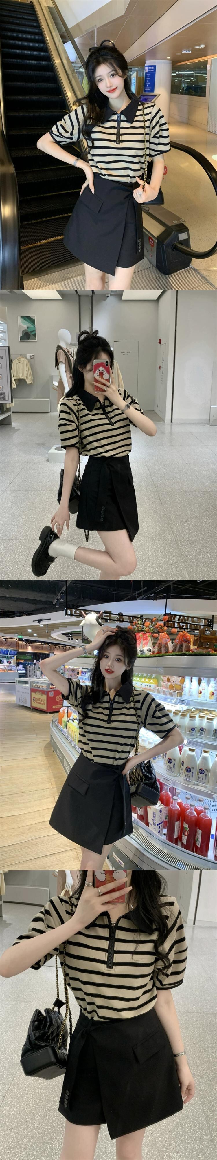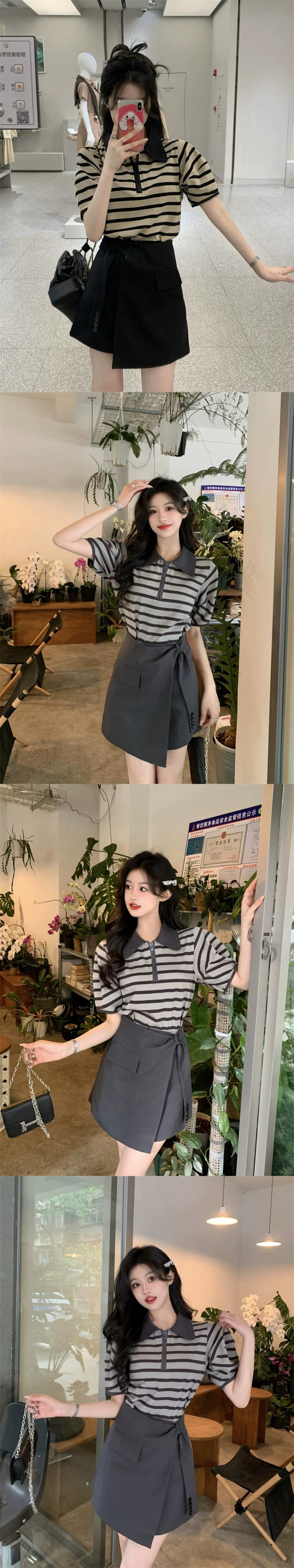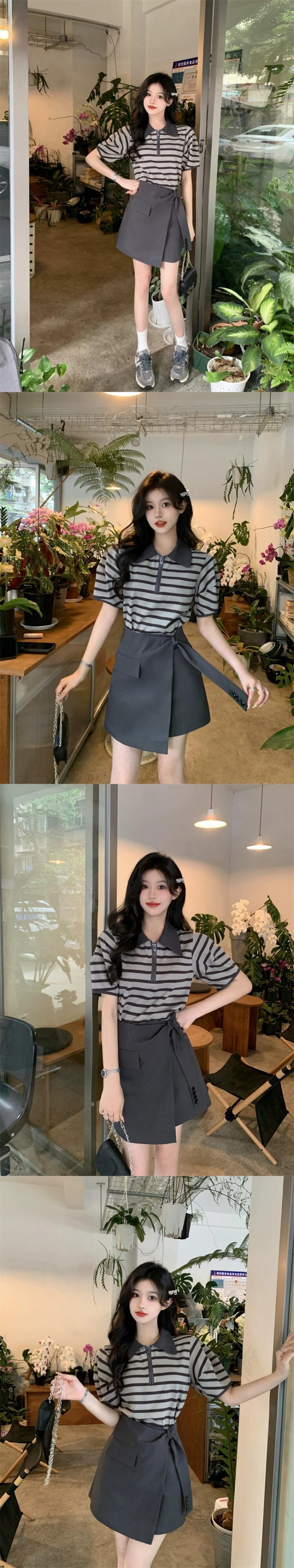 ポロ襟ストライプ半袖 Tシャツデザインセンスハイウエストスーツスカート女性の夏の 2023 新しいファッションスーツ ハイウェスト サマー 夏物 missk78182595504