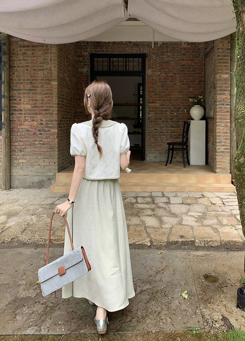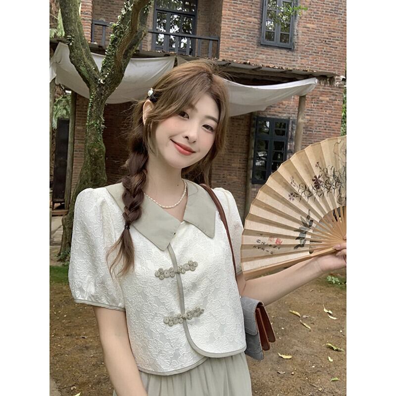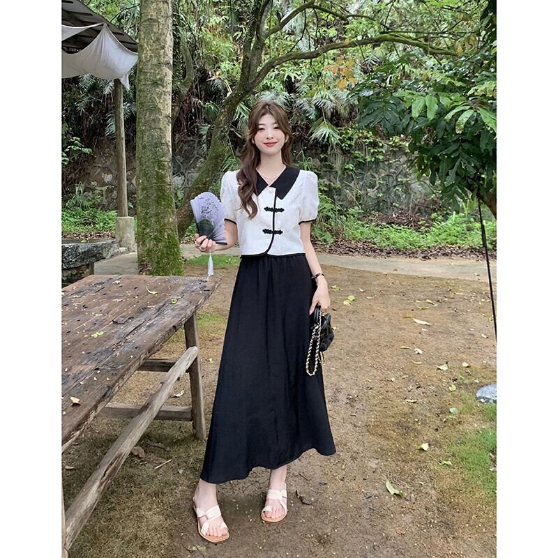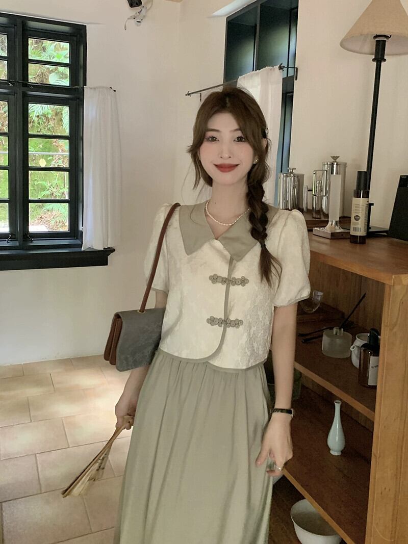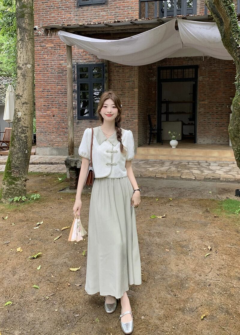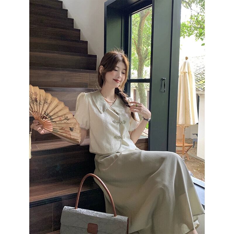中国風の国民風ボタンジャカード半袖シャツ夏 2023 新しいハイウエスト A ラインスカートスーツの女性のファッション ハイウェスト サマー 夏物 Aライン missk55711866899
