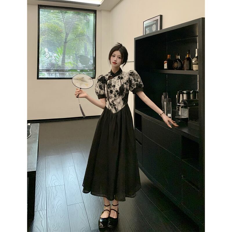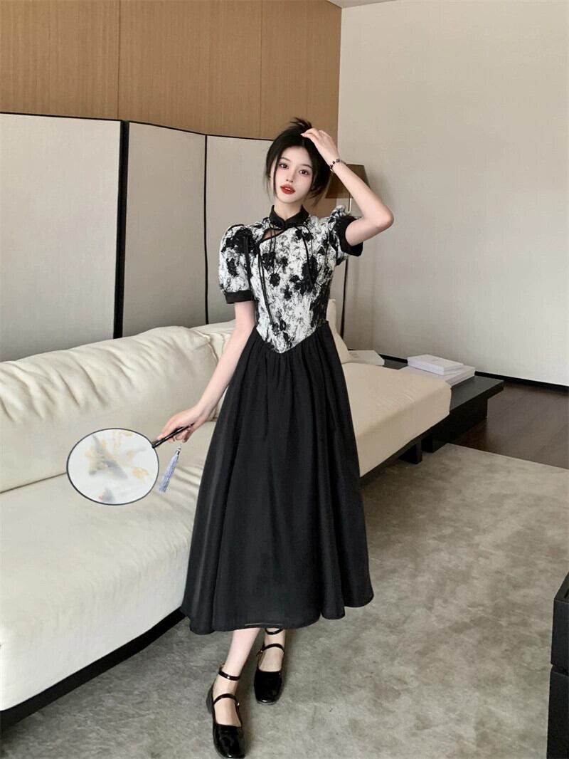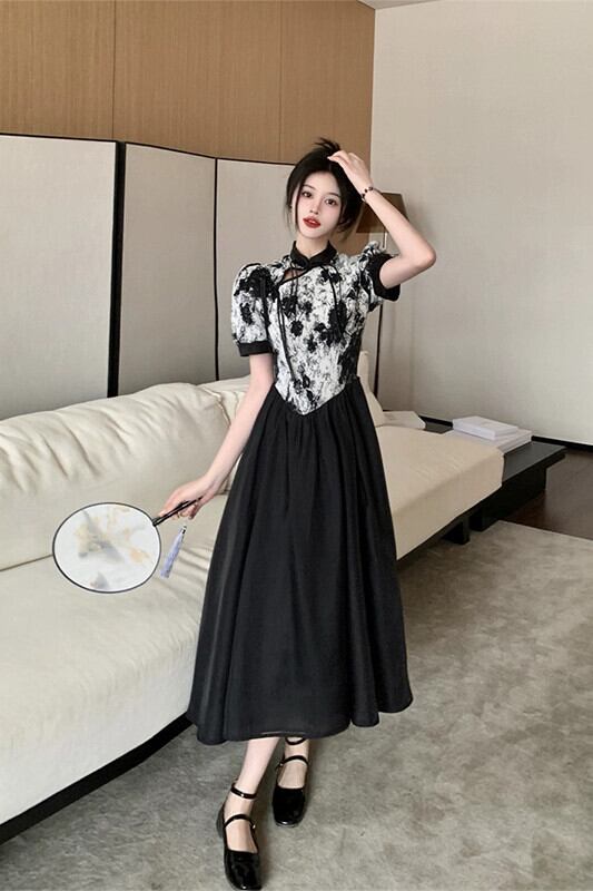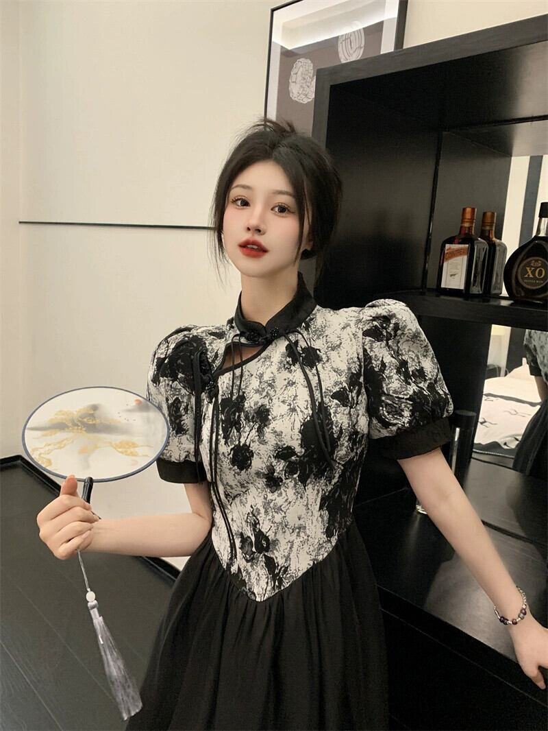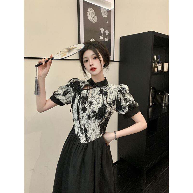 中国風ドレスの女性の 2023 夏の新しいウエストライン痩身ミッドレングス水墨画スプライシング半袖 A ラインスカート サマー 夏物 Aライン missk19965720372