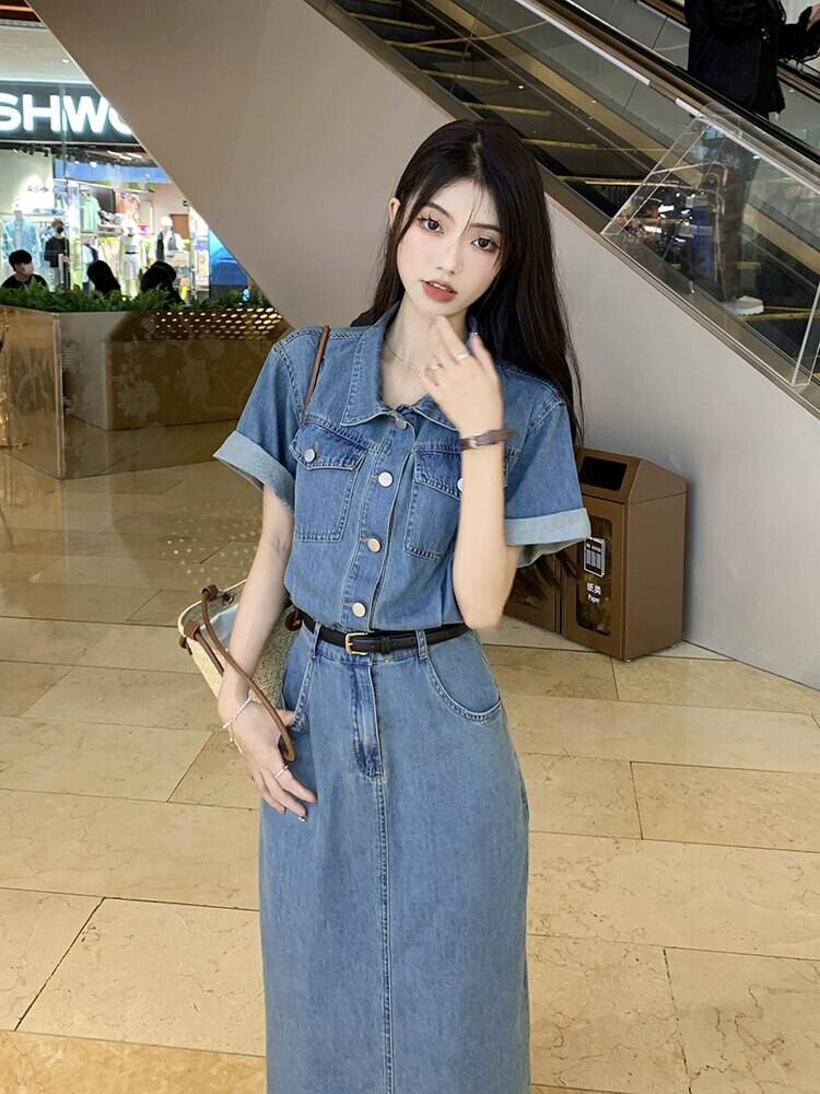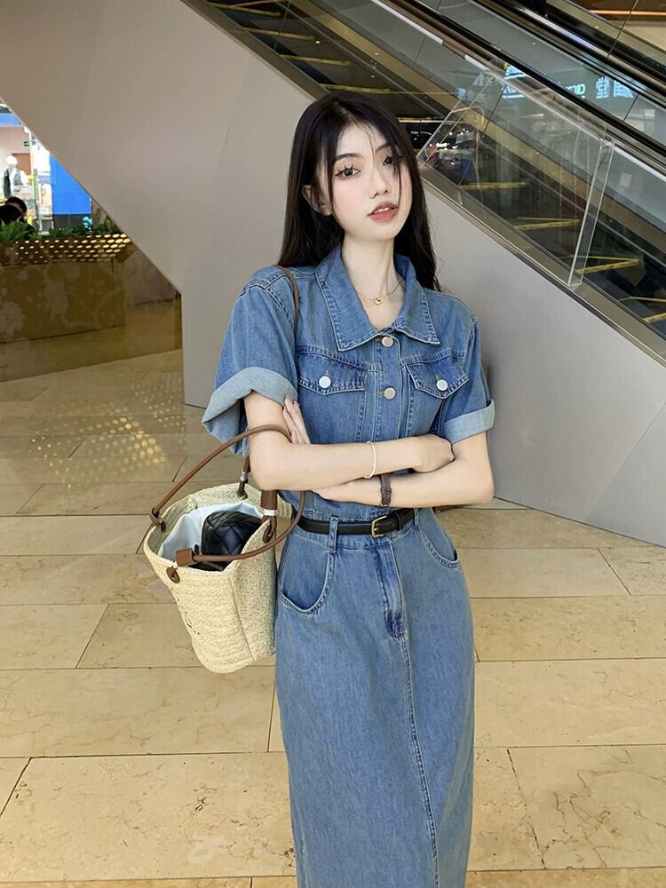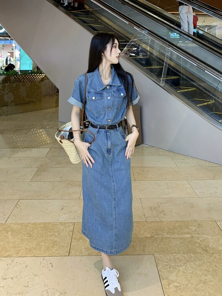 レトロデニムドレスレディース2023夏新スタイルスリムウエストポロカラーミッドレングススリット半袖スカート サマー 夏物 missk69226472638