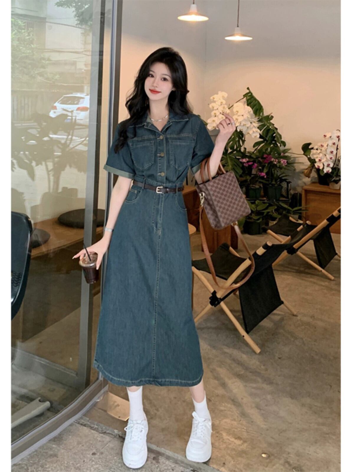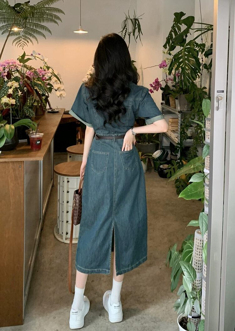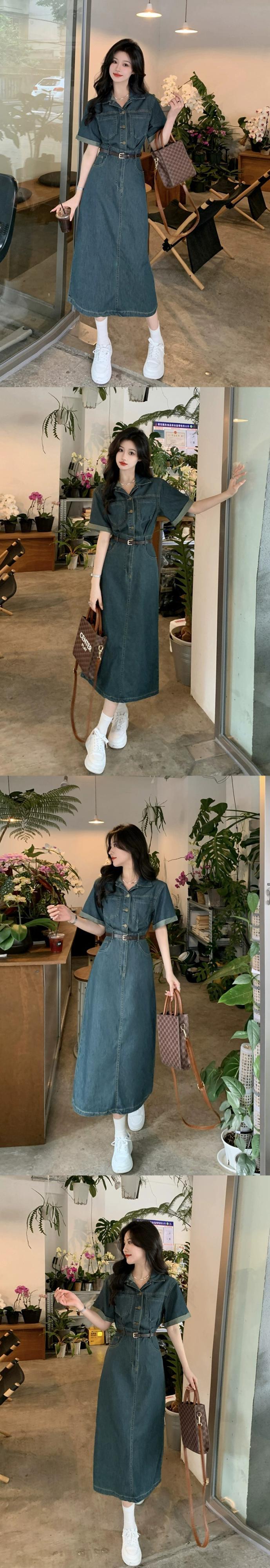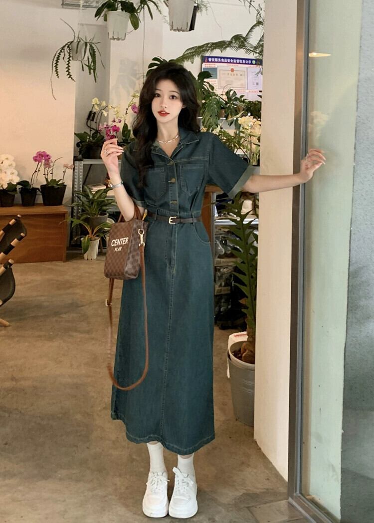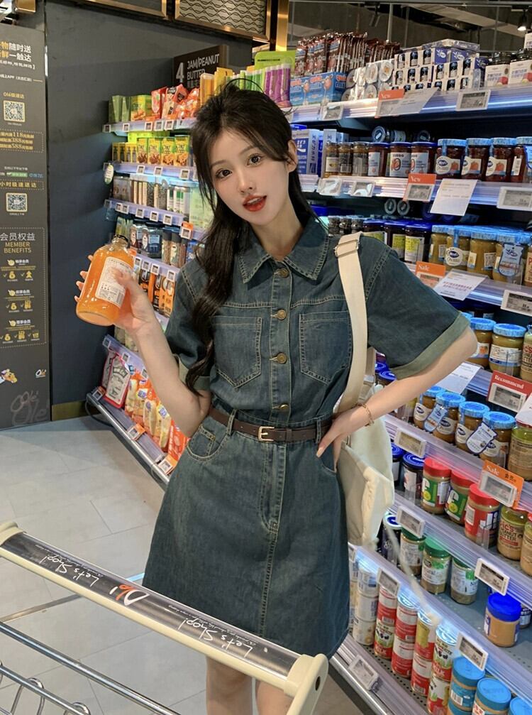 ポロカラー半袖デニムドレス夏 2023 新しいニッチデザインセンスウエストミドル丈スカート婦人服 サマー 夏物 missk31423500522