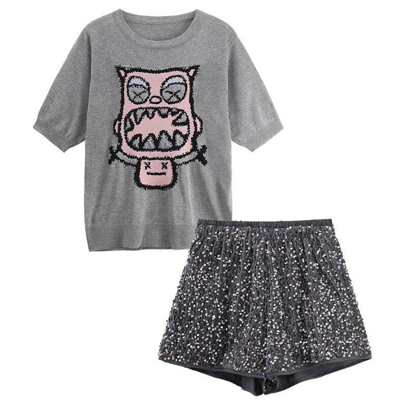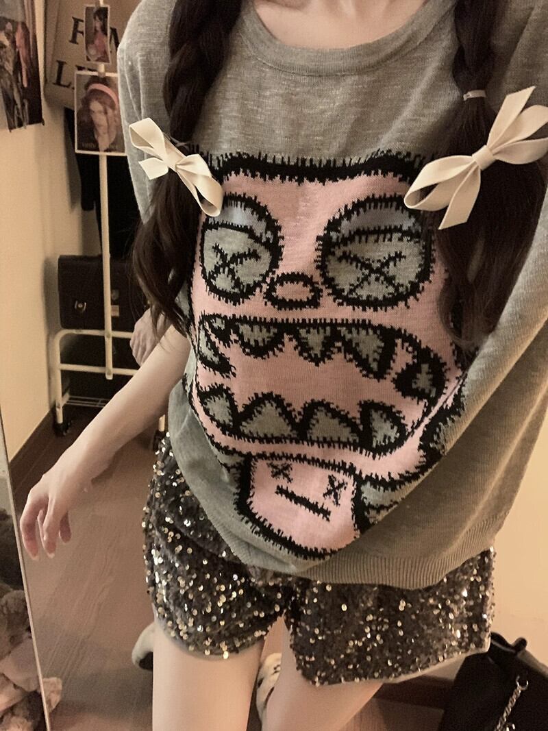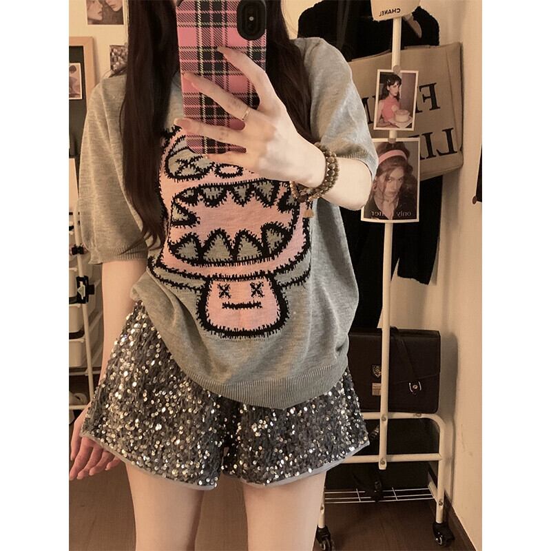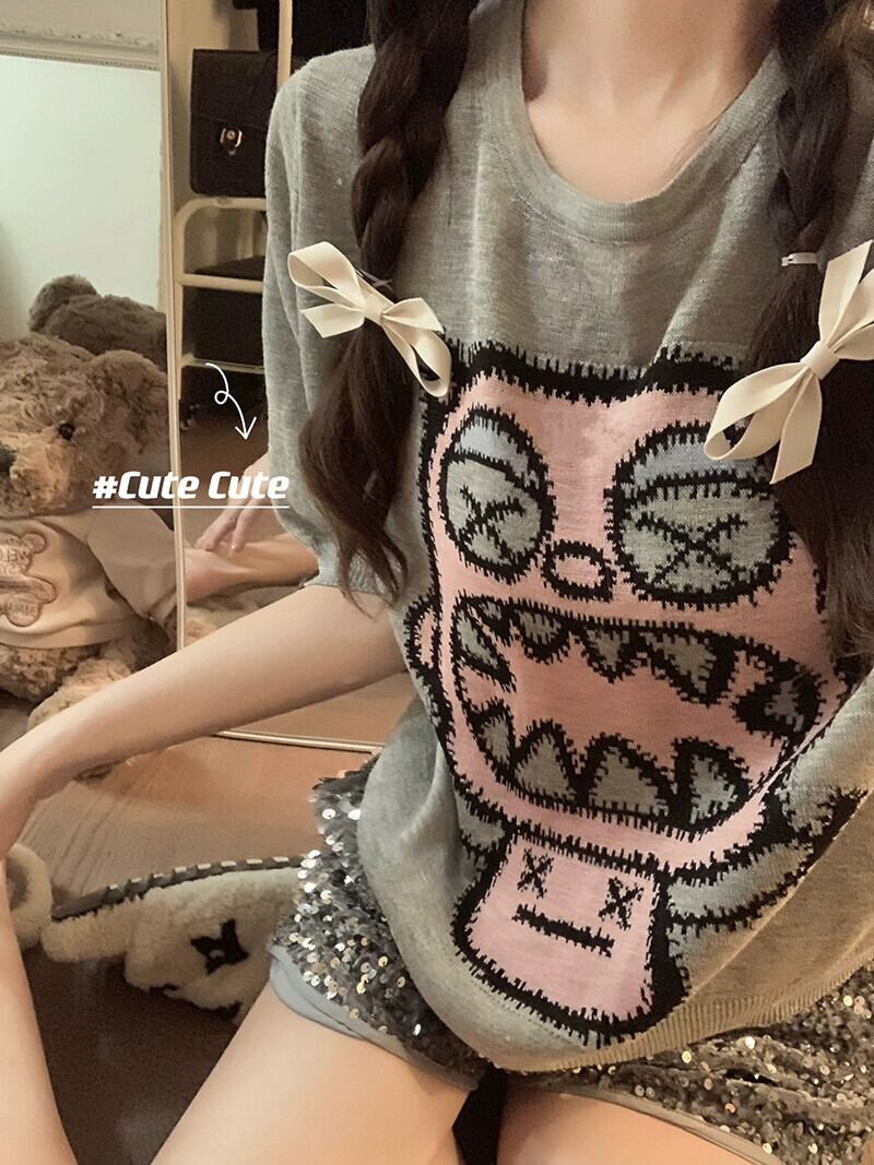 楽しい漫画デザインセンス半袖ニットセーター女性の夏バージョン 2023 新しいルーズラウンドネックオールマッチトップス サマー 夏物 Oネック missk61869158529