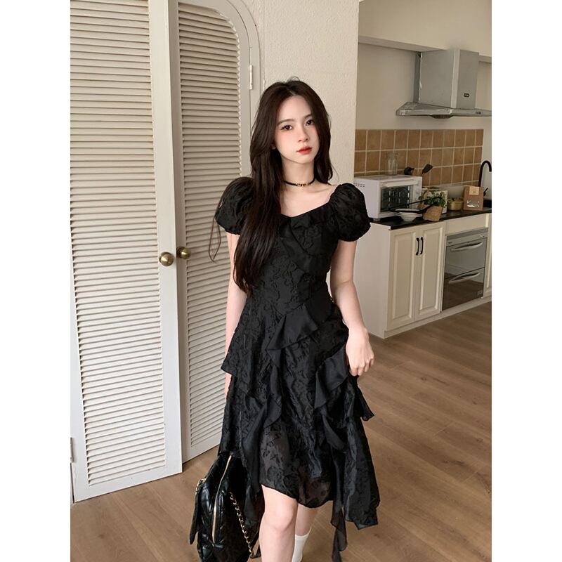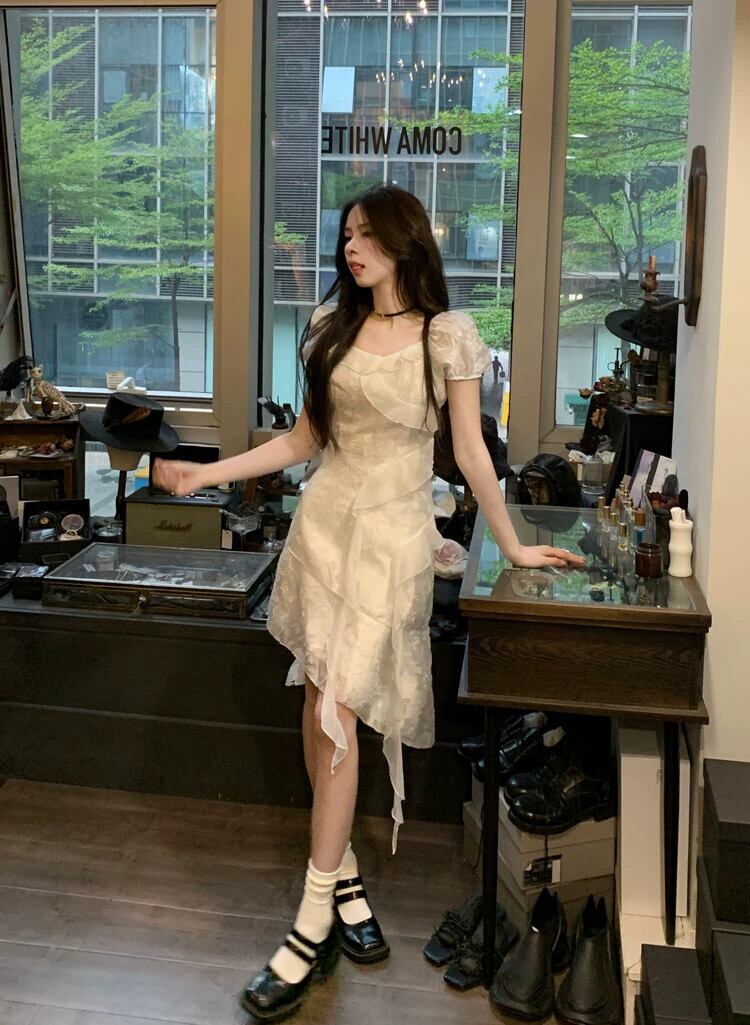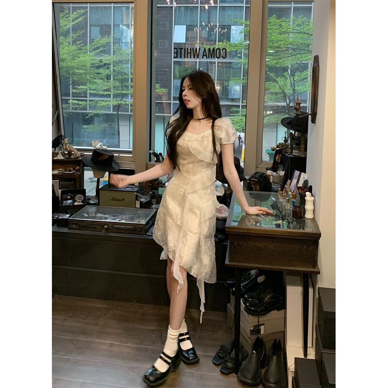 夏 2023 フレンチティーブレイクフリル不規則なウエストスリムミッドレングスパフスリーブドレス女性 ラッフル サマー 夏物 missk71774909388