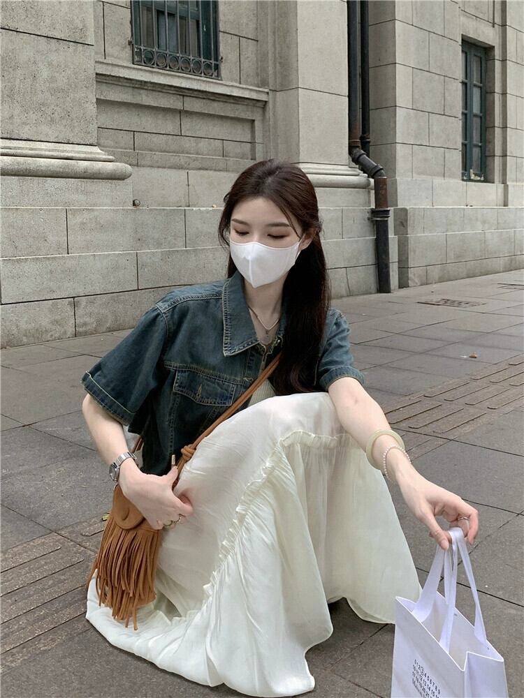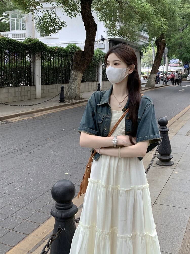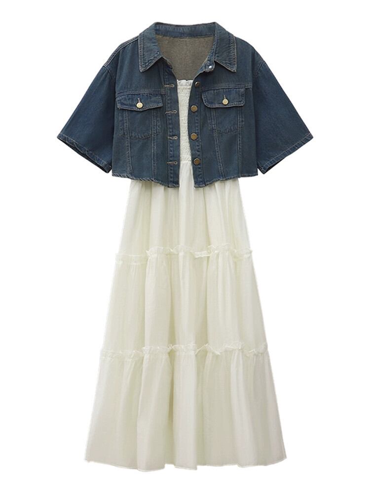 ショートデニムジャケット優しい風ミドル丈木耳サイドサスペンダードレス女性2023夏新作2点セット サマー 夏物 missk52155391897