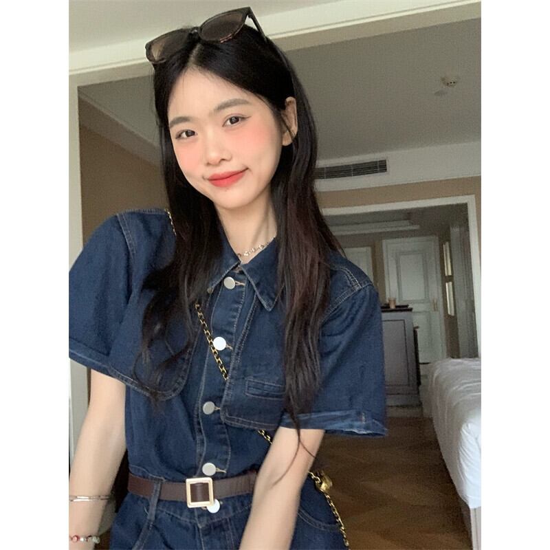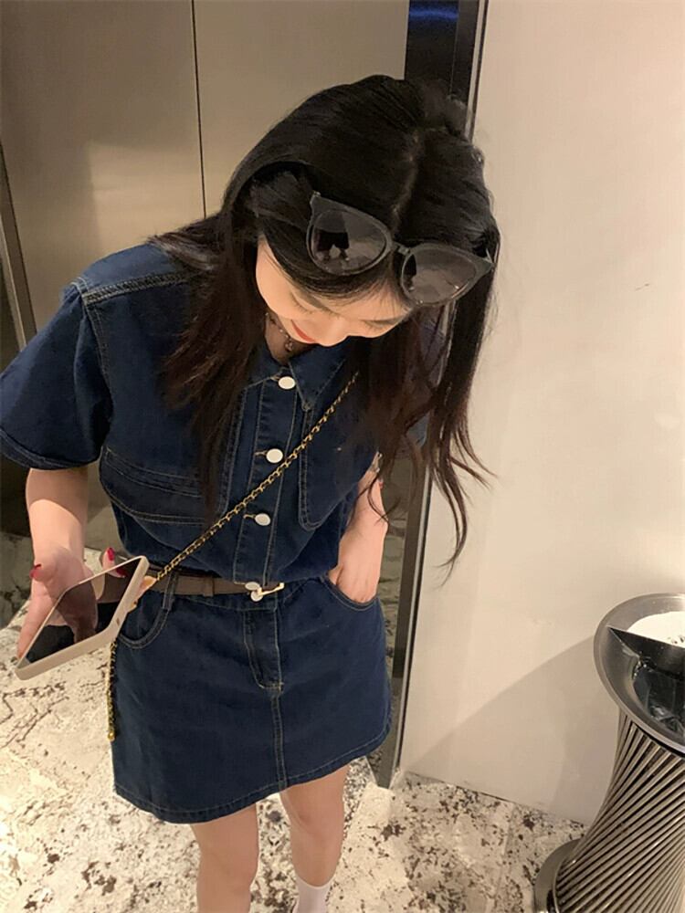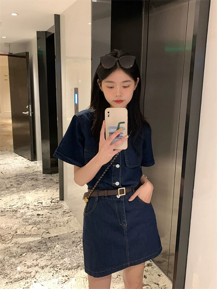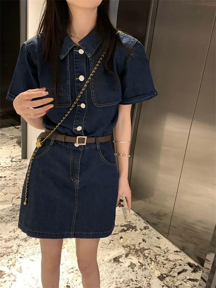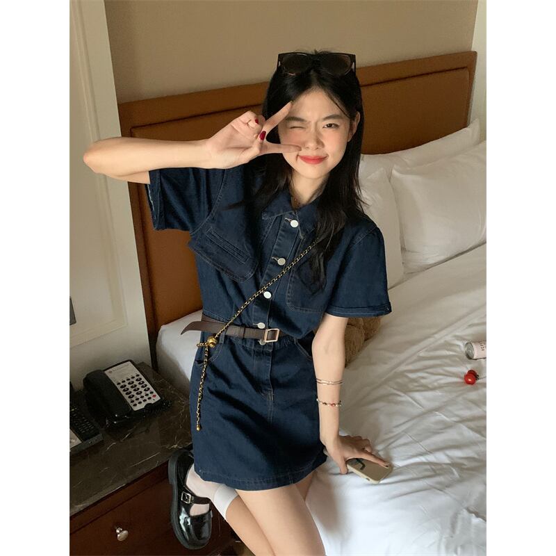 アメリカンポロカラー半袖デニムドレスレディース夏新レトロウォッシュウエスト小さなAラインスカート サマー 夏物 missk15810857061