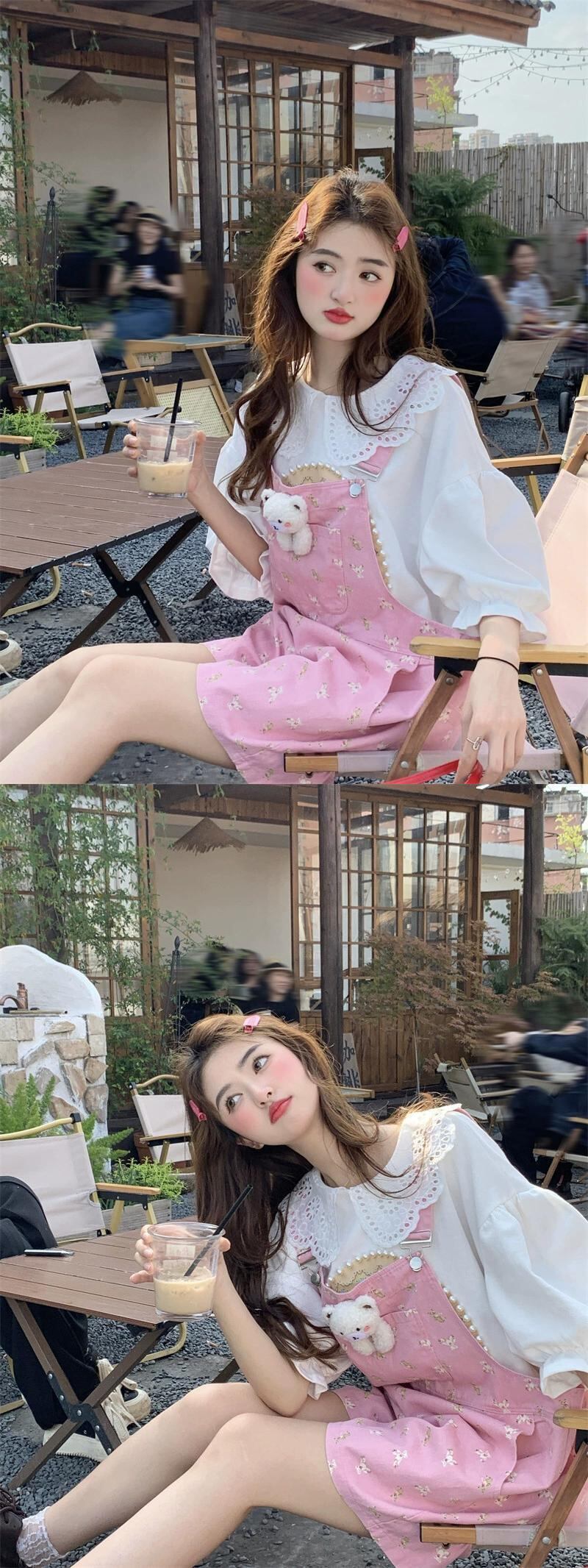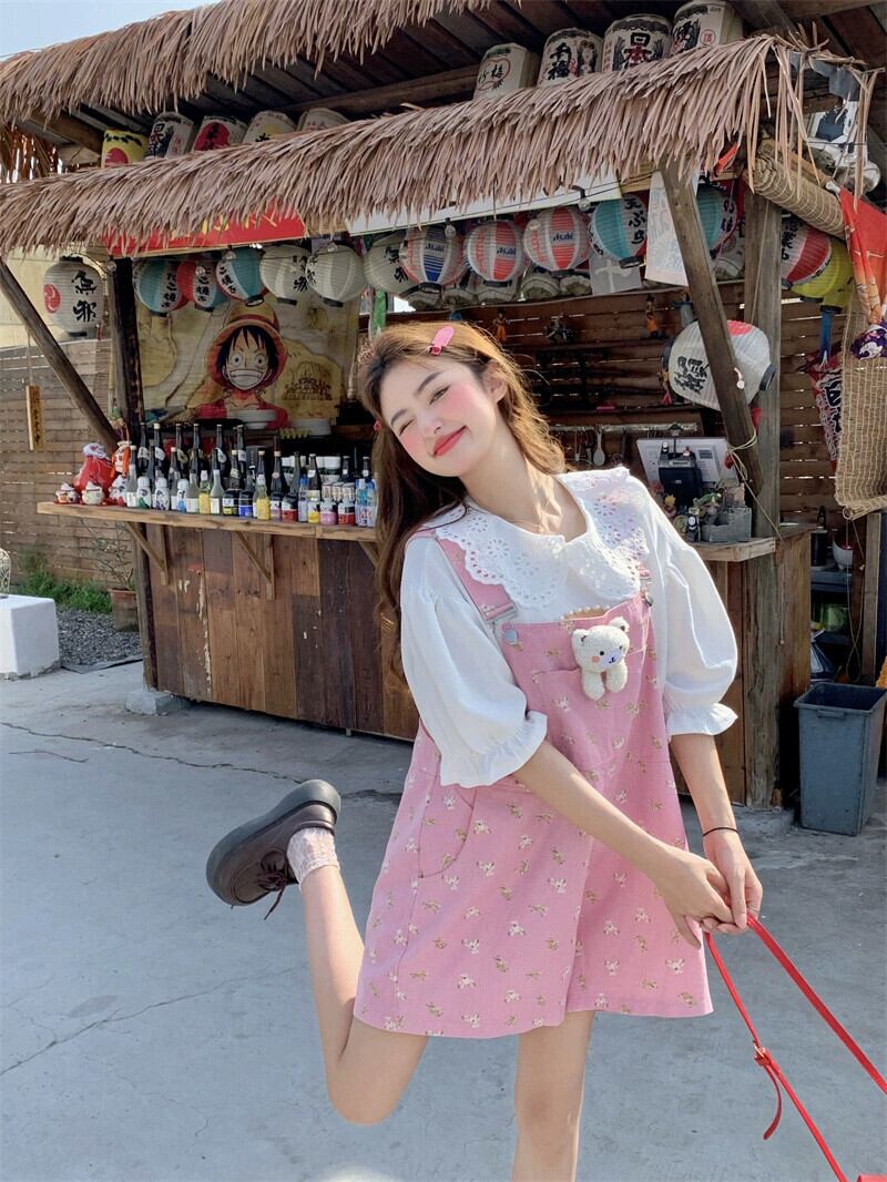 色:ドールカラーTシャツ,ピンクのオーバーオール