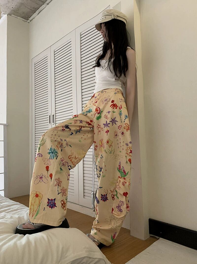 シックな落書きプリントカジュアルパンツ夏の新しいハイウエストデザインハイウエストルーズフロアレングスワイドレッグパンツ婦人服 サマー 夏物 missk47063383637