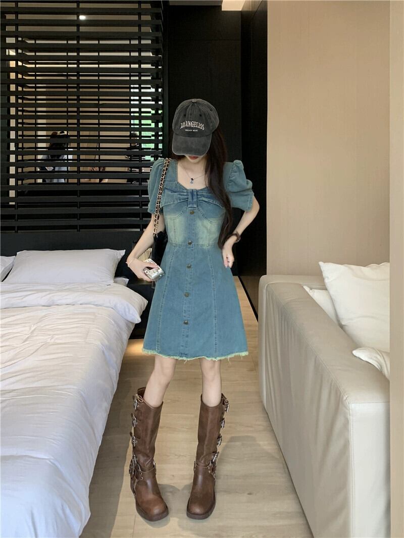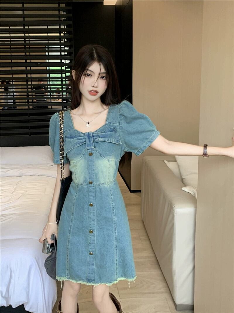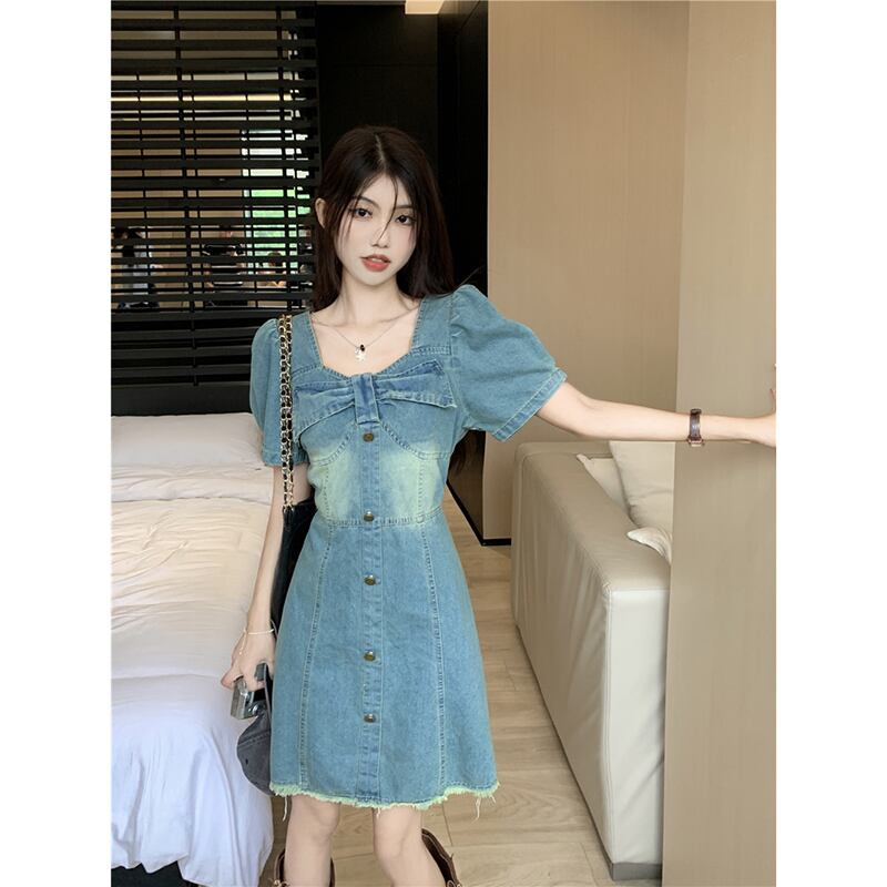 ちょう結びデニム半袖ドレスの女性の夏の 2023 新しい香港スタイルのデザインセンスウエストウエスト痩身 A ラインスカート サマー 夏物 Aライン missk64228353523