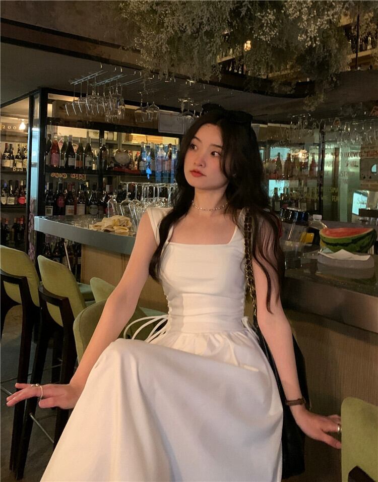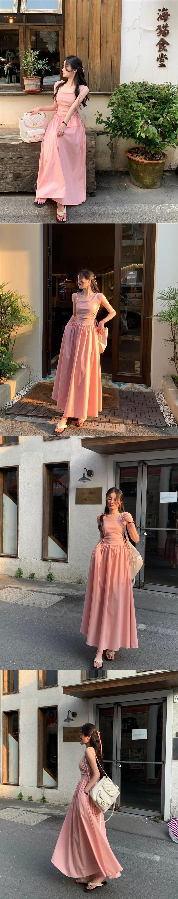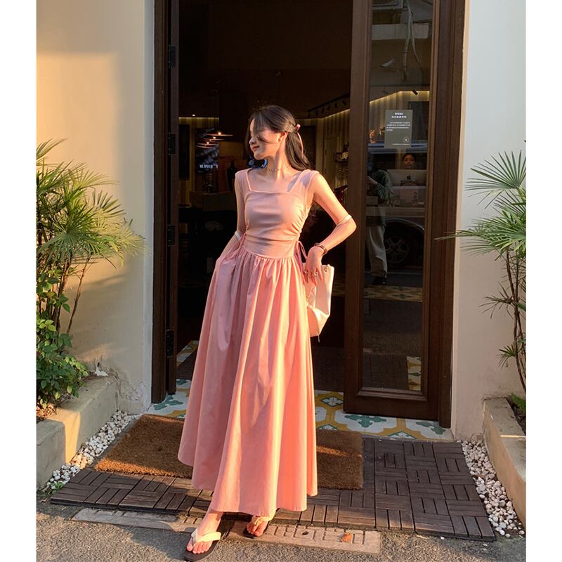ヘップバーンスタイル巾着ノースリーブドレス女性の夏 2023 新しいフレンチピンクウエストスクエアカラーシックなロングスカート サマー 夏物 スクウェア missk587293363