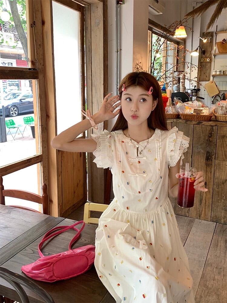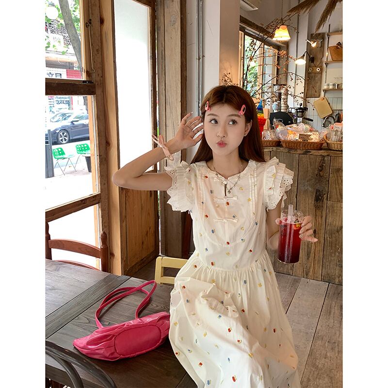 Feifei スリーブドレス レディース 夏 2023 甘い刺繍感覚ウエスト スリム ミドル丈 A ライン スカート レッド 大人ガーリー スウィート キュート カジュアル サマー 夏物 Aライン missk60886402344