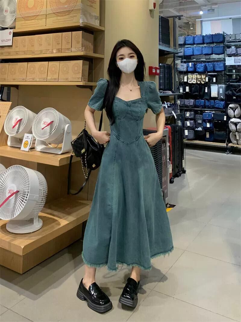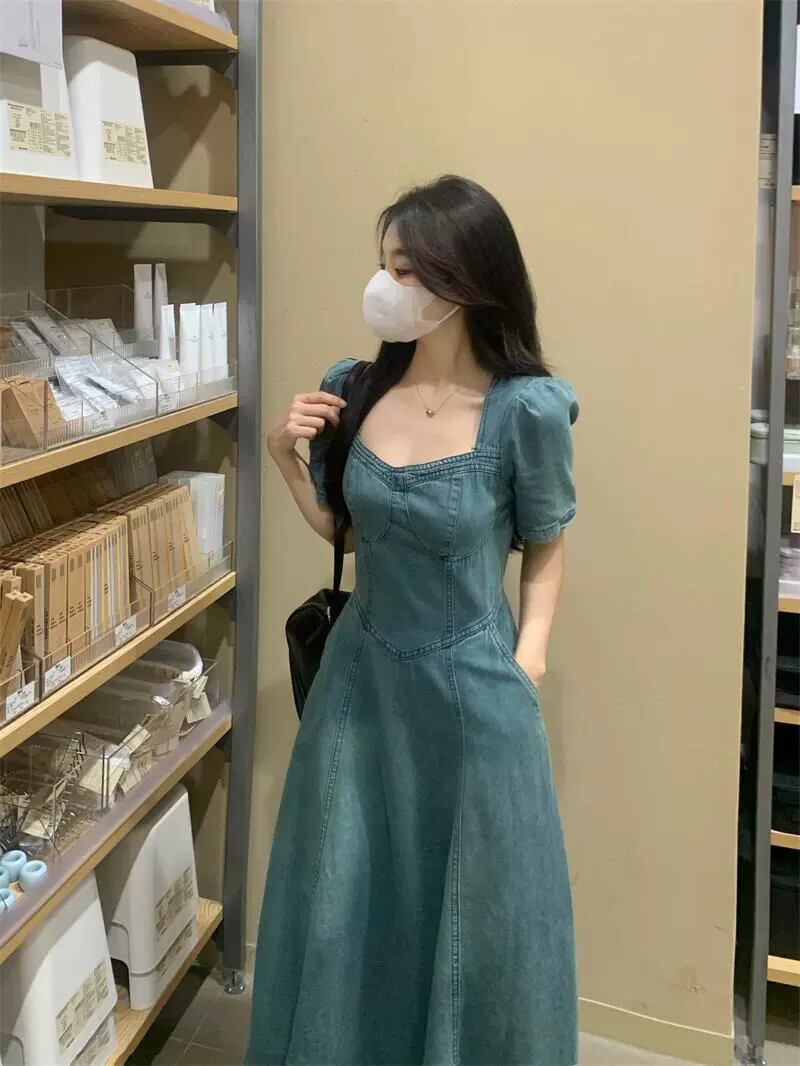 スクエアカラーデニムドレスの女性の夏の 2023 新しいレトロウエスト痩身ミッドレングスフレンチ半袖 A ラインスカート サマー 夏物 Aライン スクウェア missk66989661109