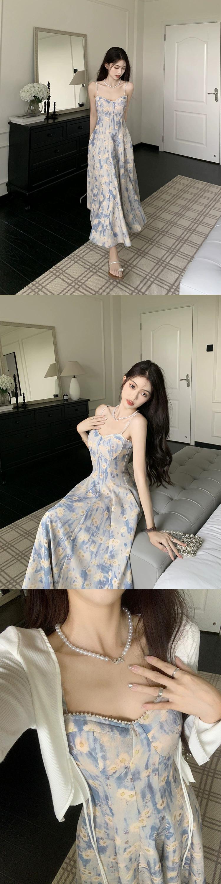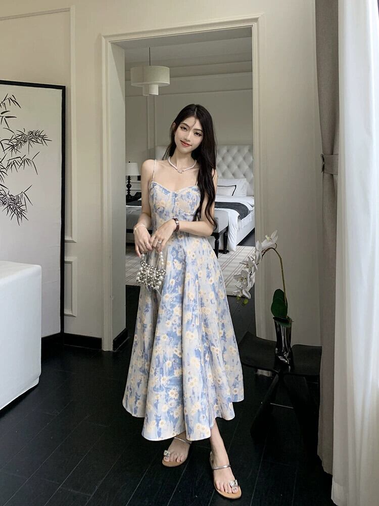 優しい風油絵花柄ドレス夏 2023 ウエスト痩身ミッドレングス初恋サスペンダースカート サマー 夏物 missk11240807500