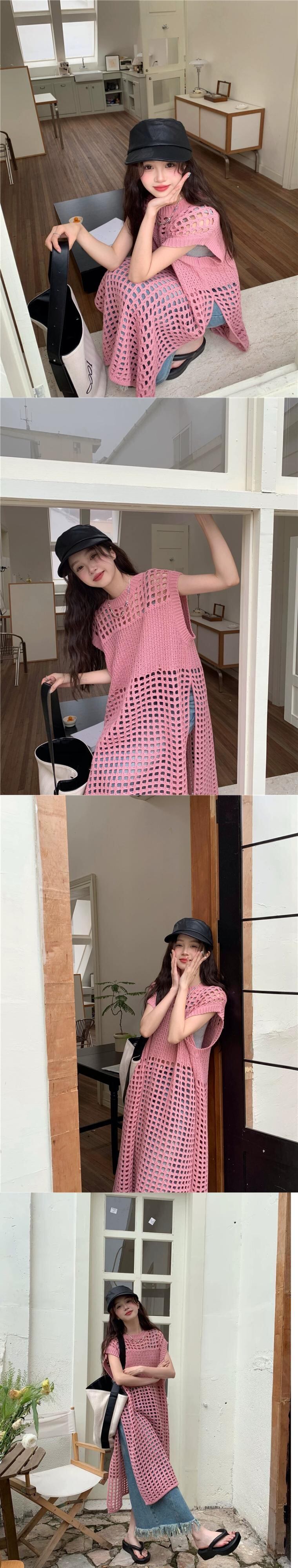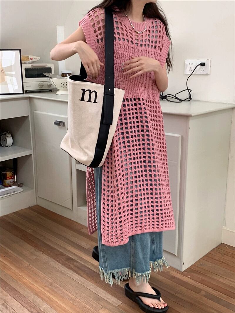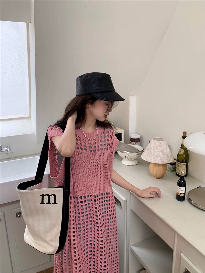 2023 夏の新スタイルファッショナブルなデザインセンスレイヤード中空シックな eign スタイルノースリーブロングニットスカート女性の潮 レッド サマー 夏物 missk16588391717