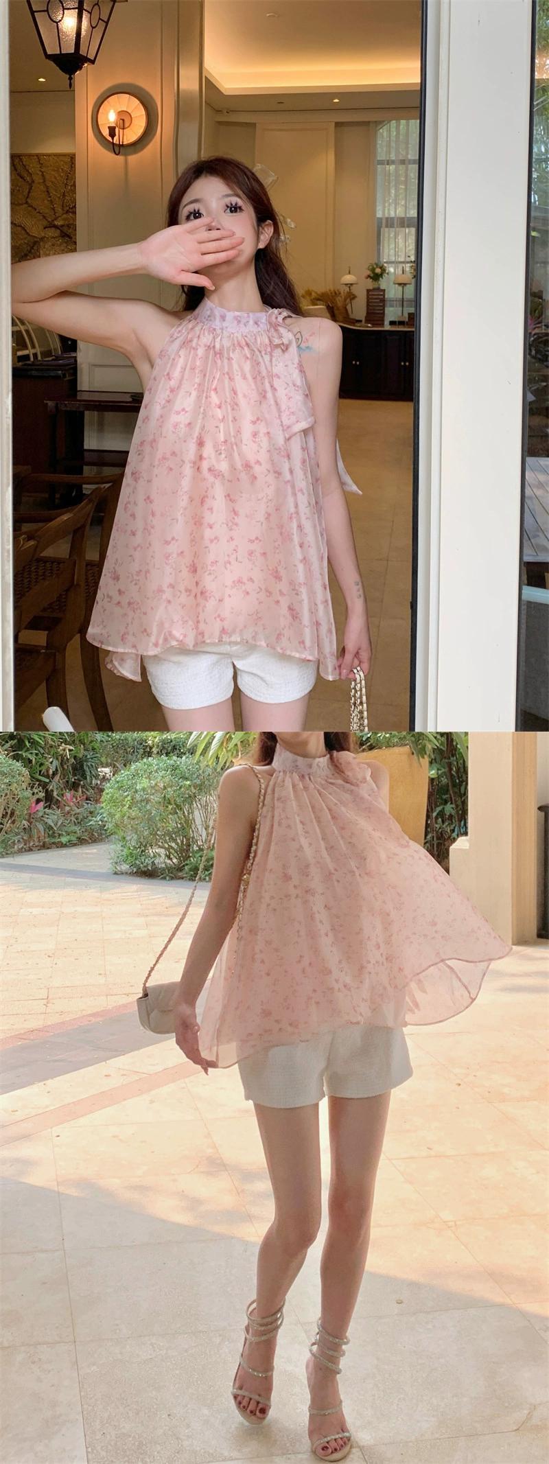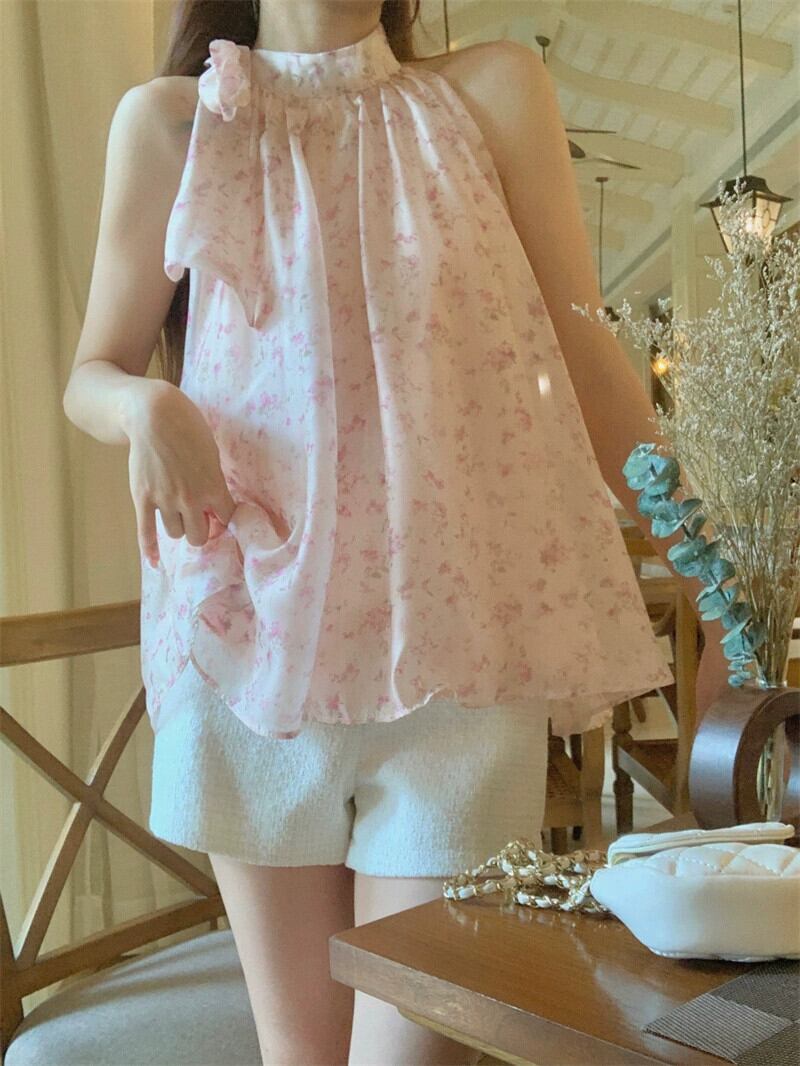 甘いハンギングネック花柄ノースリーブシフォンシャツ女性の夏の新しい薄いセクションストラップレスハイエンドシックなトップ女性のイン 大人ガーリー スウィート キュート カジュアル サマー 夏物 missk37449277321