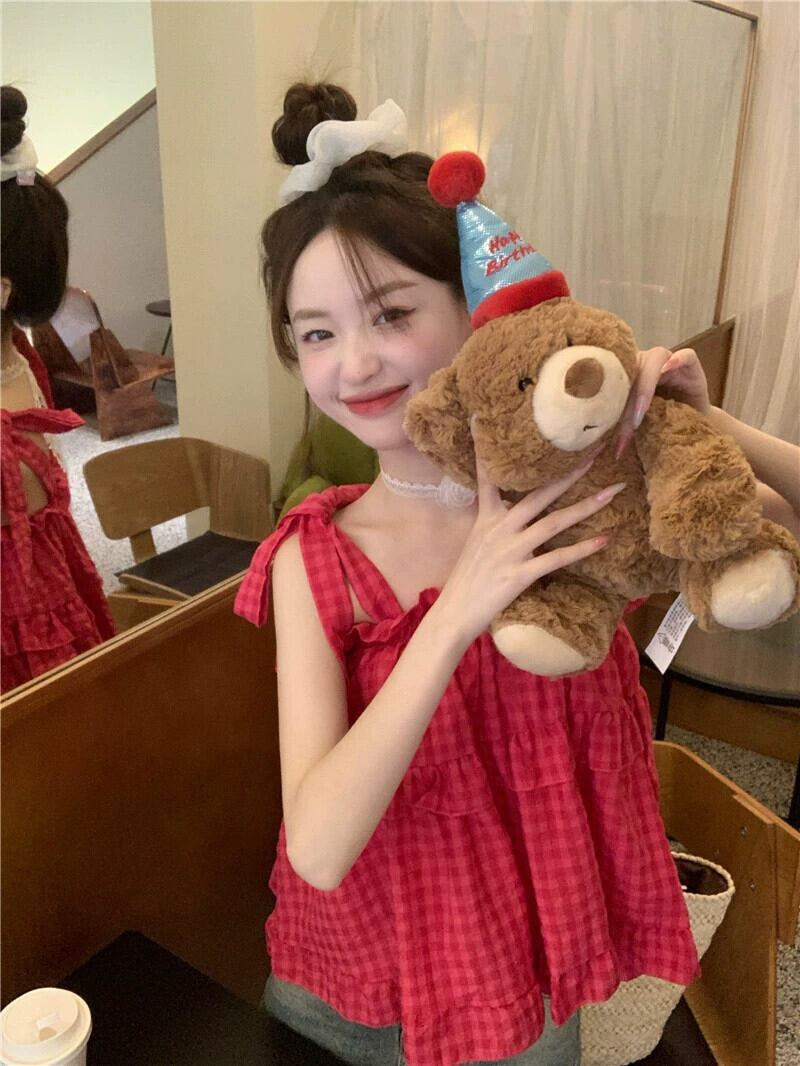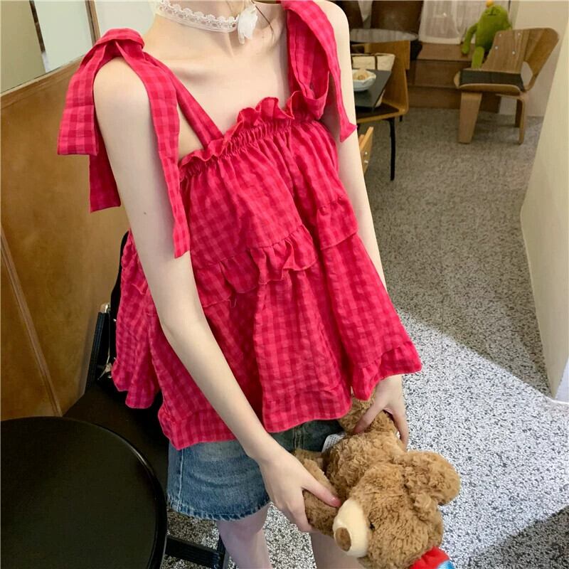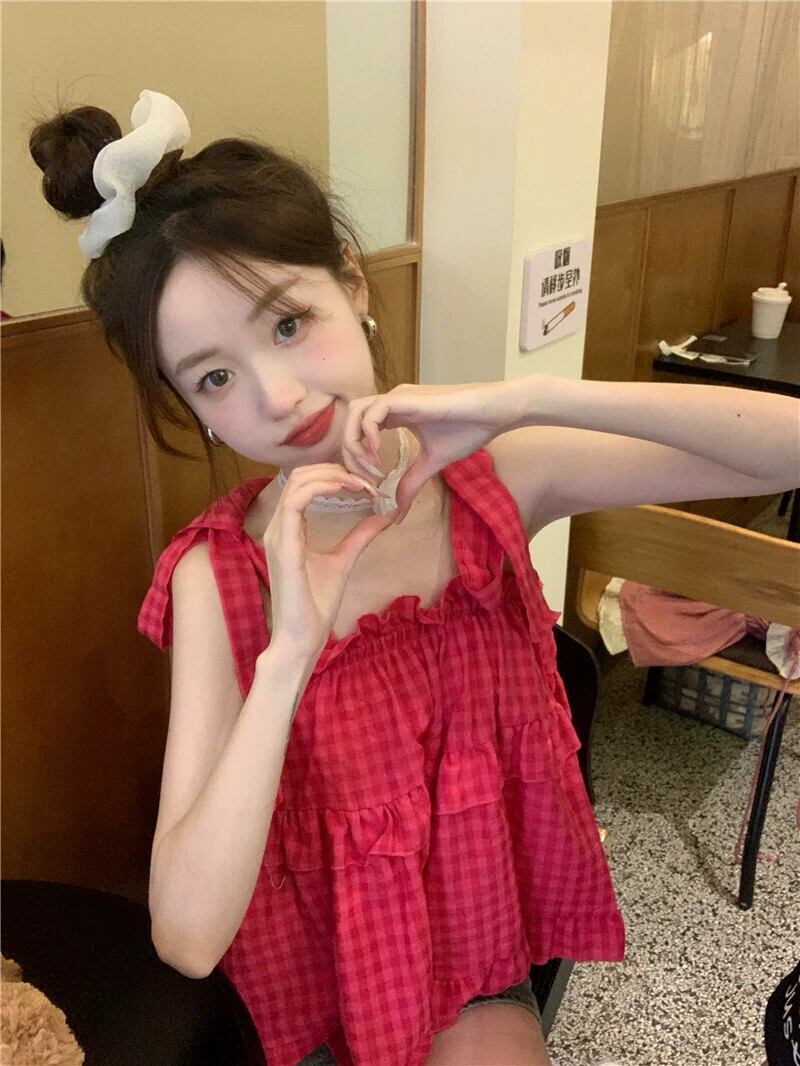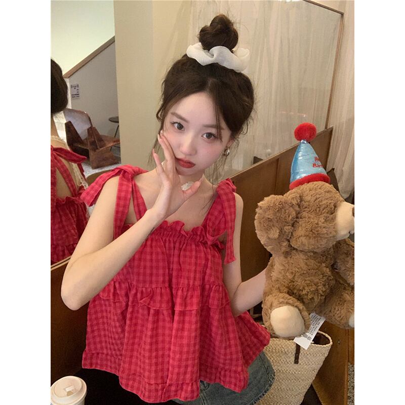 甘いチェック柄レースリボンベストトップ女性の夏の新しいスリムフィットと薄いアウターウェアショートサスペンダー 大人ガーリー スウィート キュート カジュアル サマー 夏物 missk84859530167