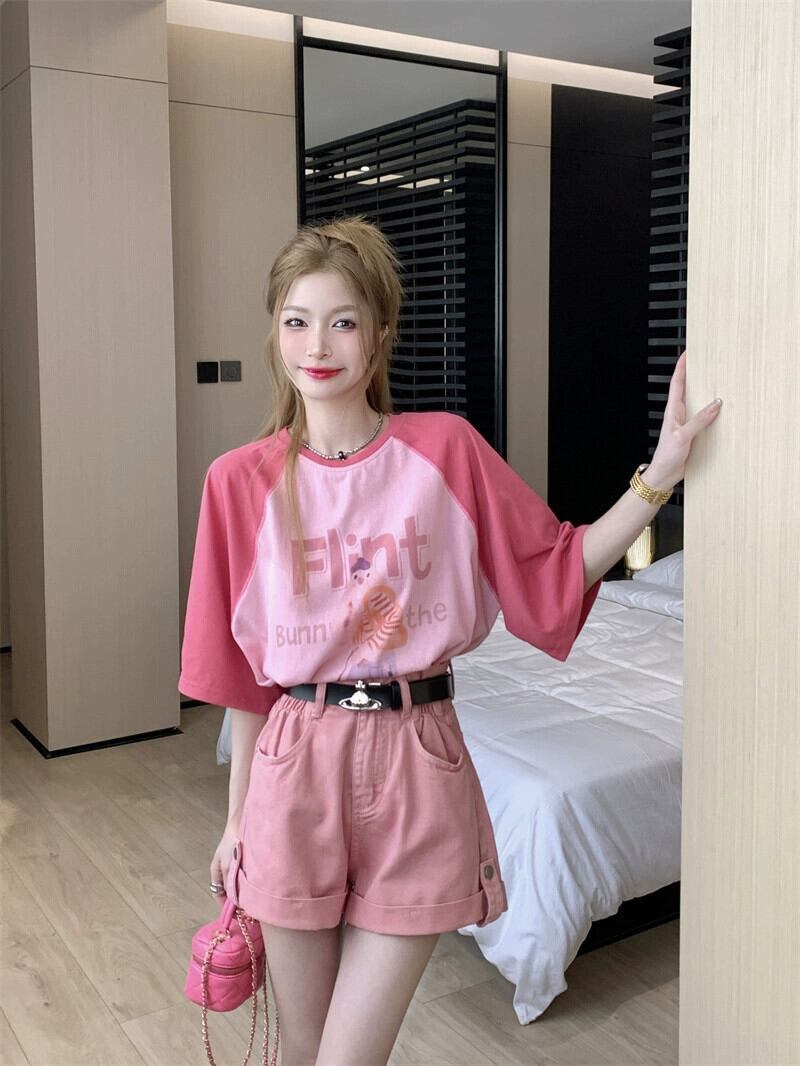 漫画のプリントカラーマッチング半袖 Tシャツハイウエストカーリーワイドレッグショーツ女性の夏の 2023 新しいファッション 2 点セット ハイウェスト サマー 夏物 ブルマー missk91365686260