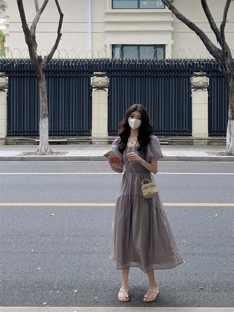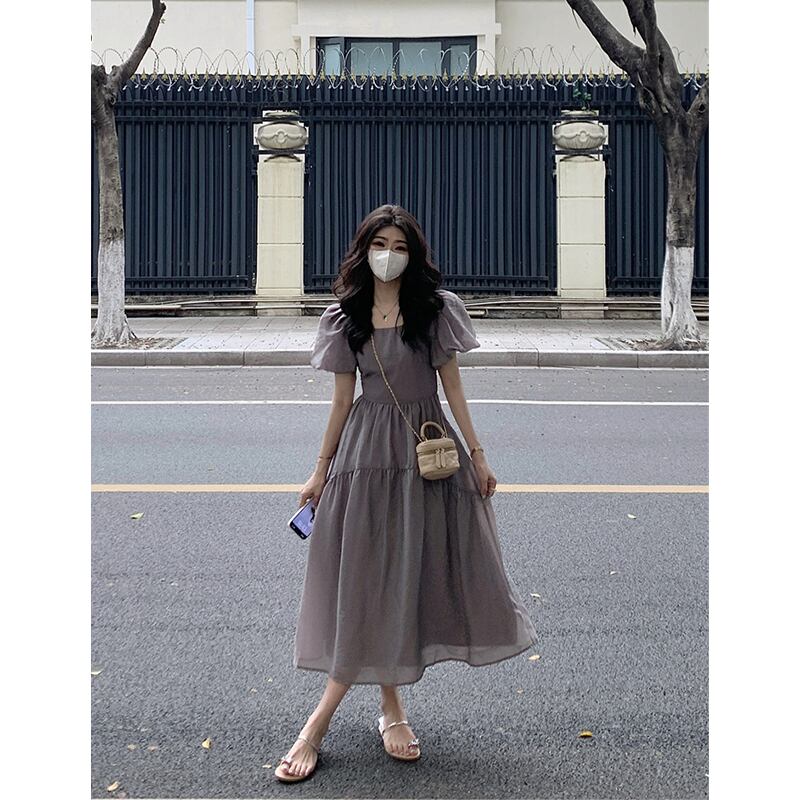 -エンド パフ スリーブ ドレス レディース 2023 夏の新しいウエストライン スリム ミッドレングス メッシュ 半袖 A ライン スカート サマー 夏物 Aライン missk4120217180