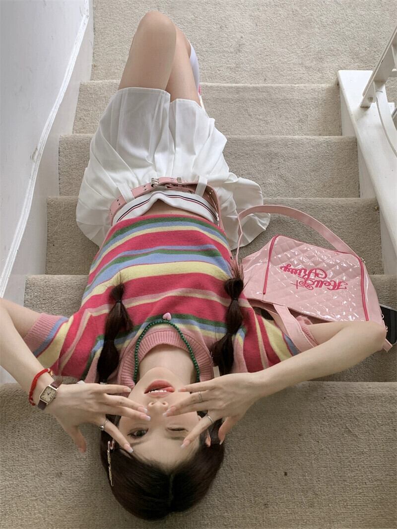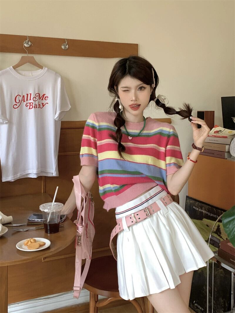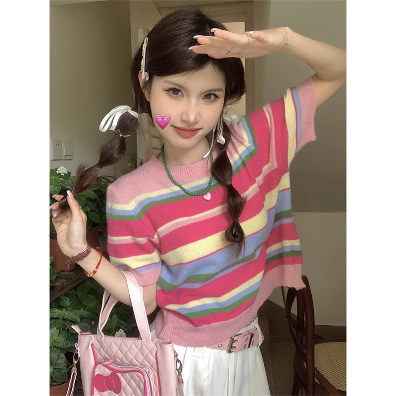 カラーストライプ半袖セーターレディース2023年夏新作甘いデザインセンス薄いセクションルーズショートトップ 大人ガーリー スウィート キュート カジュアル サマー 夏物 missk31123620252