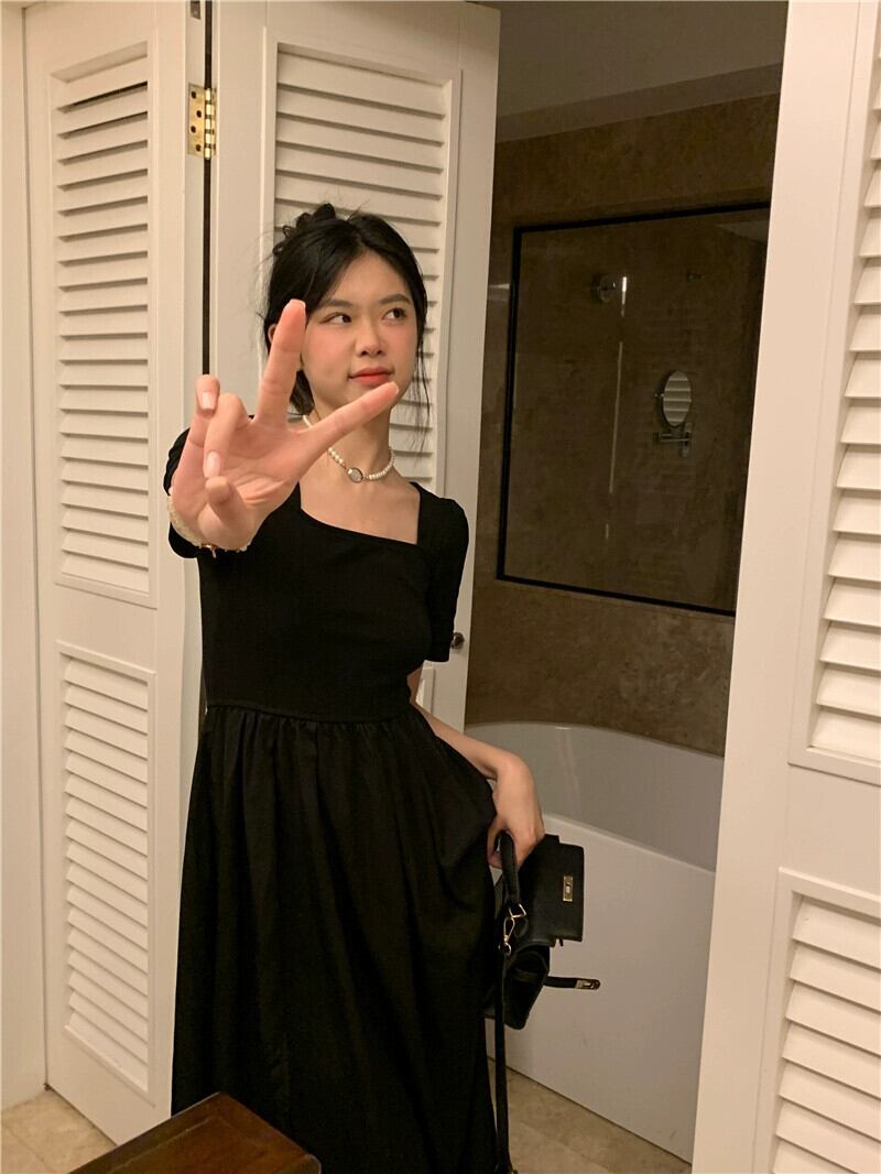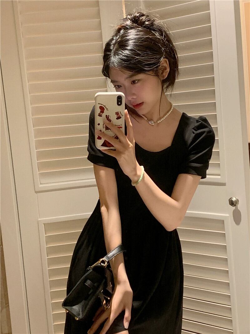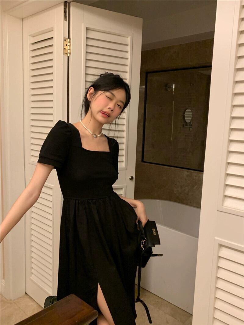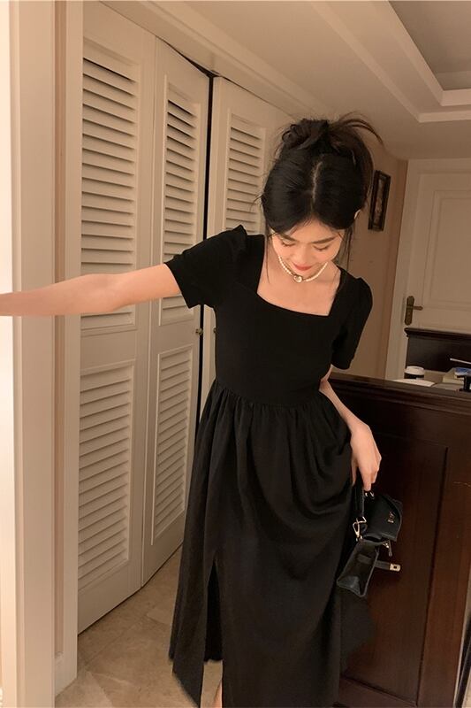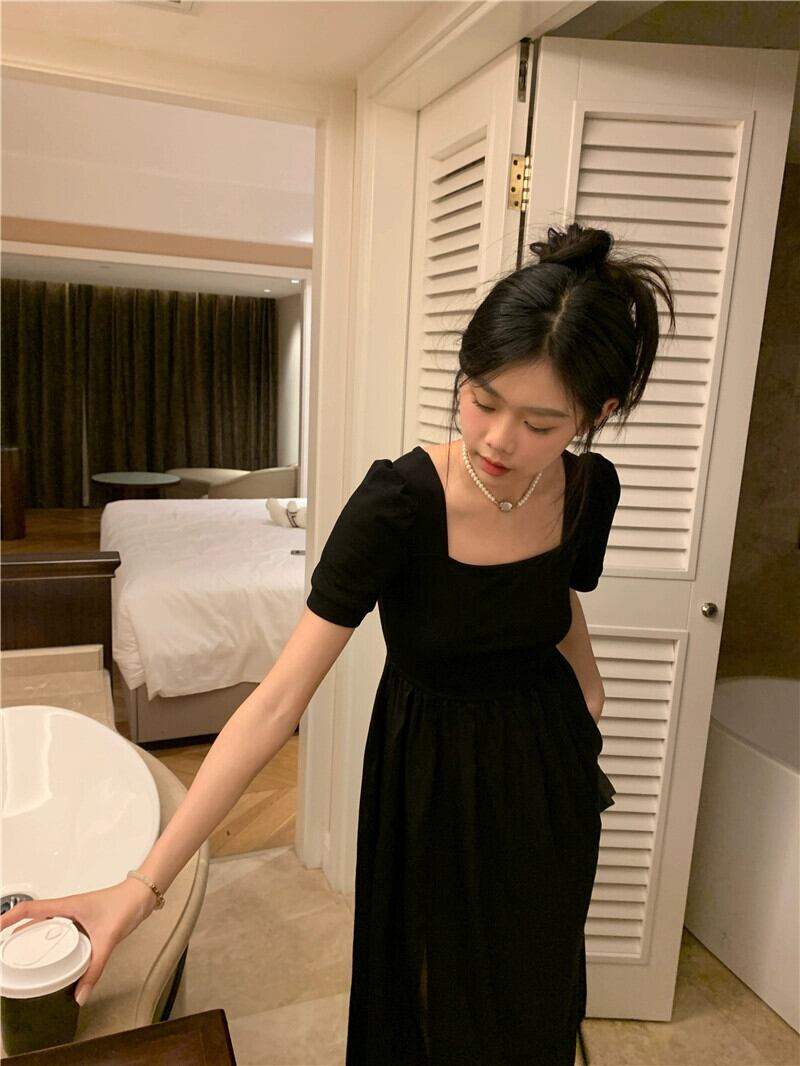 フランスの気質スクエアカラースリットドレス夏の新しいハイウエスト自己修養シックな気質シックな半袖黒ロングスカート女性 ハイウェスト ブラック サマー 夏物 スクウェア missk56922679044