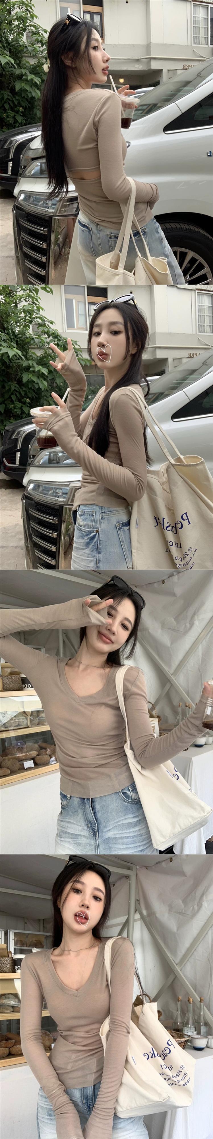 薄手の長袖スキーム Tシャツレディース 2023 夏の新しいデザインセンス中空バックレス V ネックスリムボトムシャツトップ ロング サマー 夏物 Vネック missk98373012564