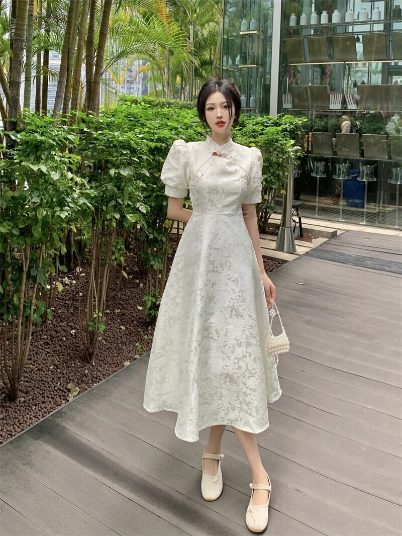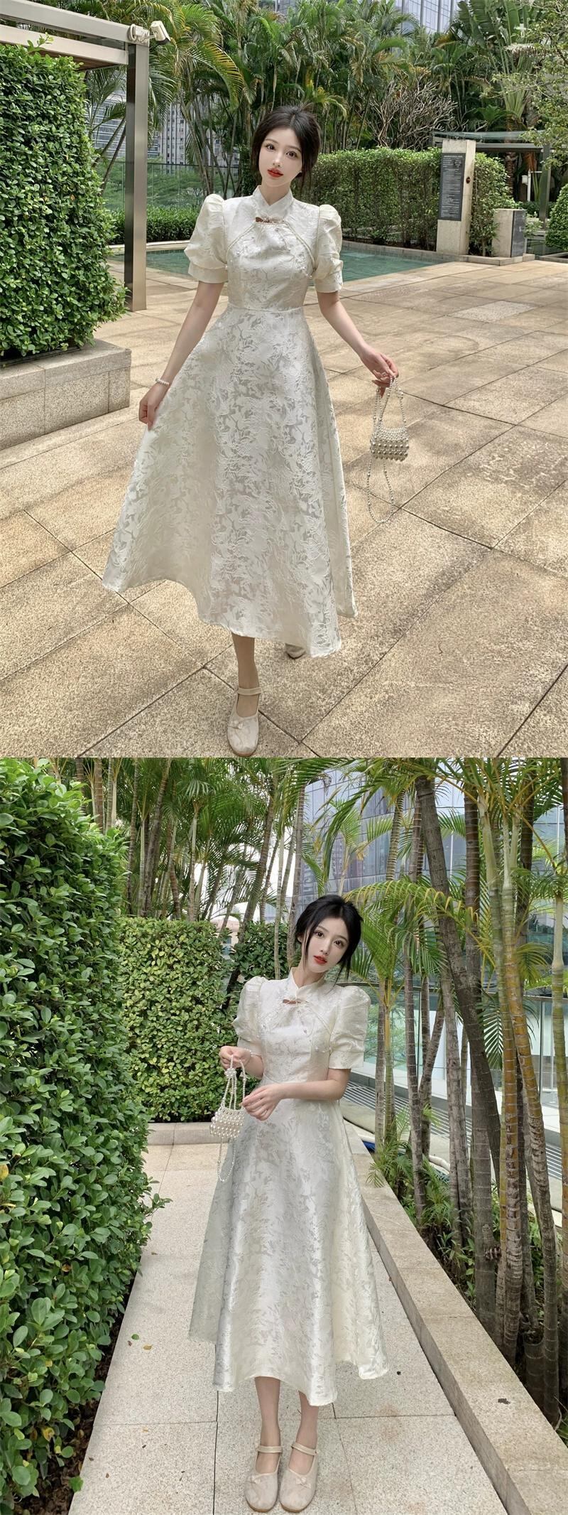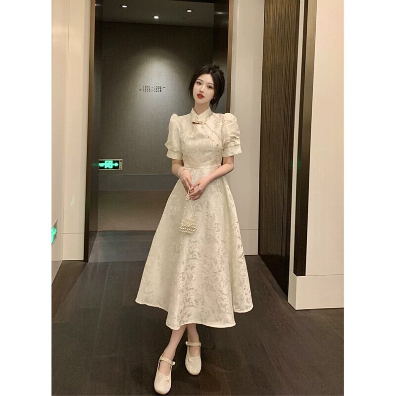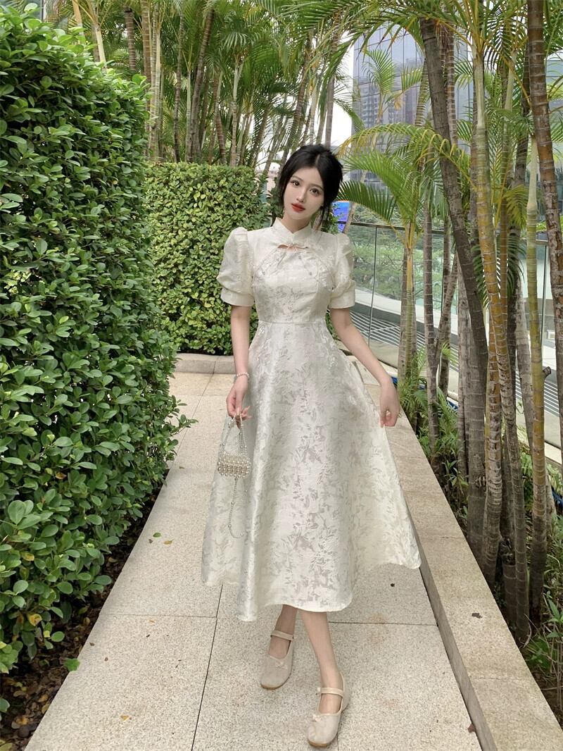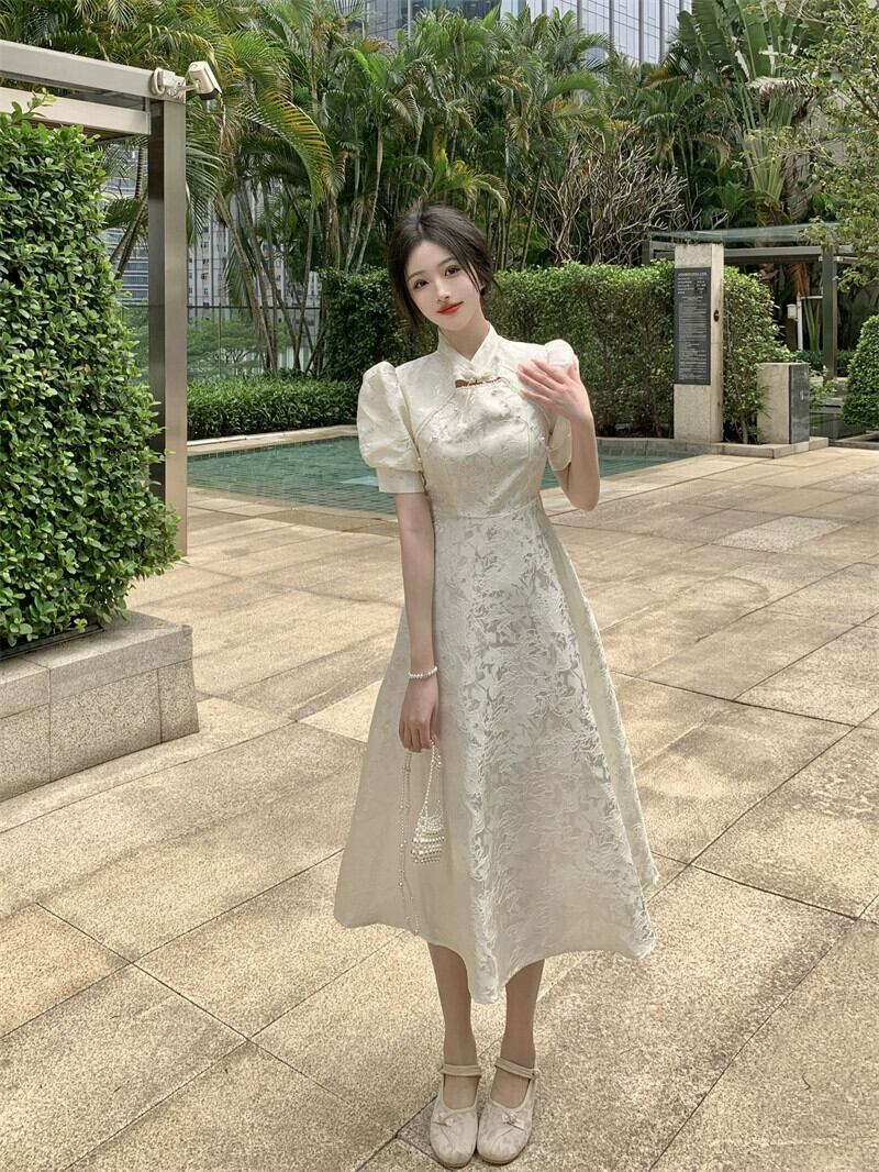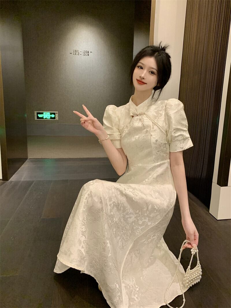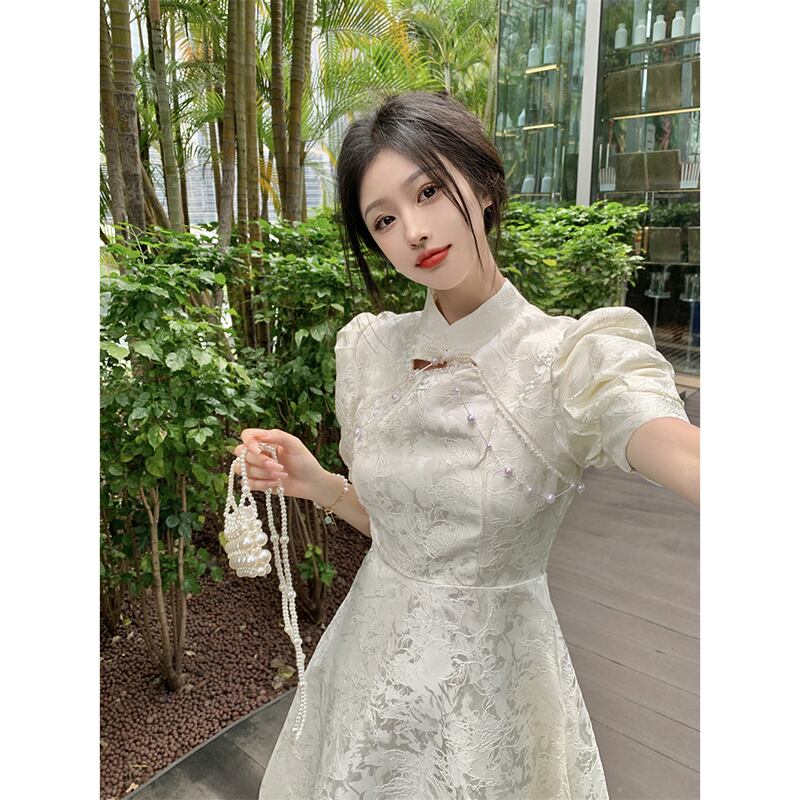 気質スタンドカラー新中国風半袖ドレス夏 2023 新しいジャカード改良されたチャイナドレス半袖ミドルスカート女性 サマー 夏物 missk513097592