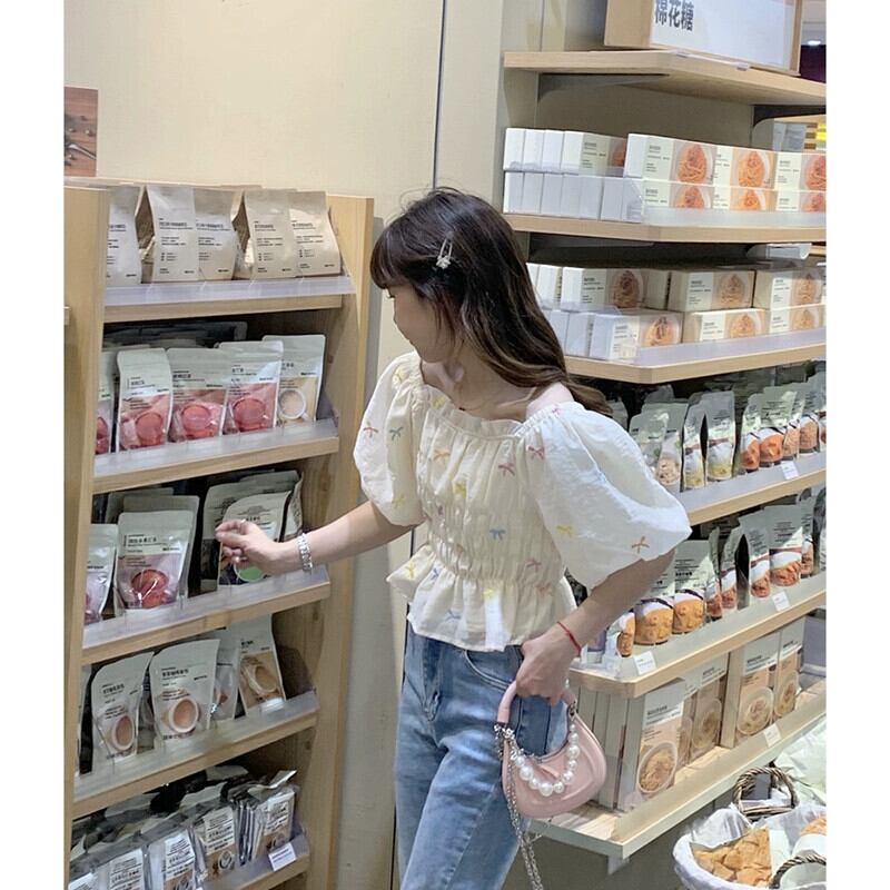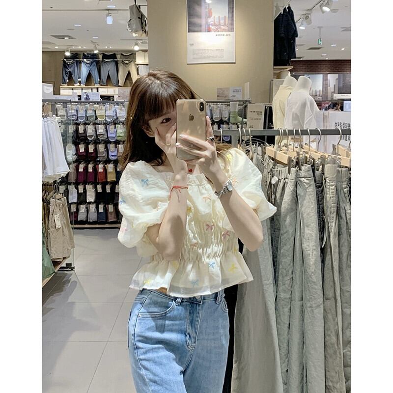 甘いスクエアカラーちょう結びシフォンシャツ夏新年齢削減デザイン折り目スーパーフェアリーパフスリーブトップ婦人服 リボン 大人ガーリー スウィート キュート カジュアル サマー 夏物 スクウェア missk91886868112