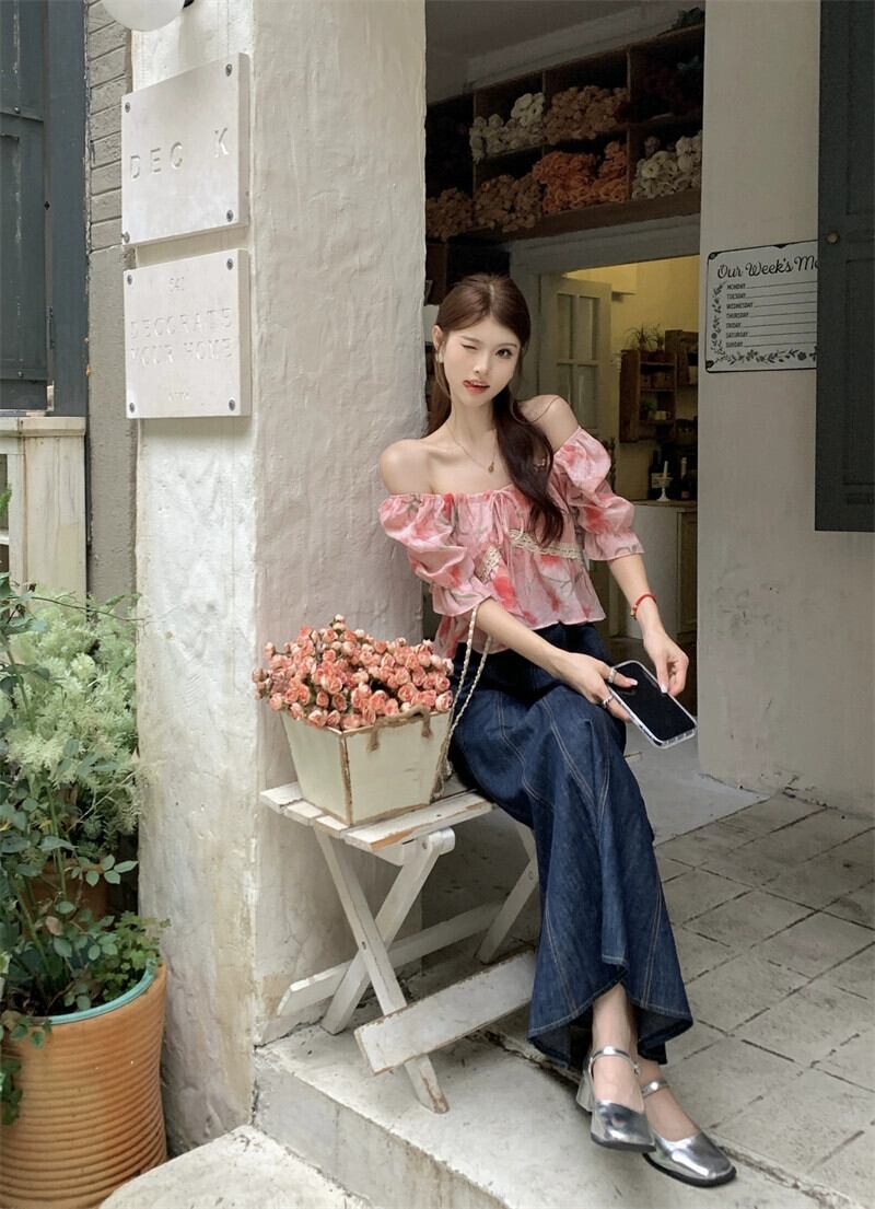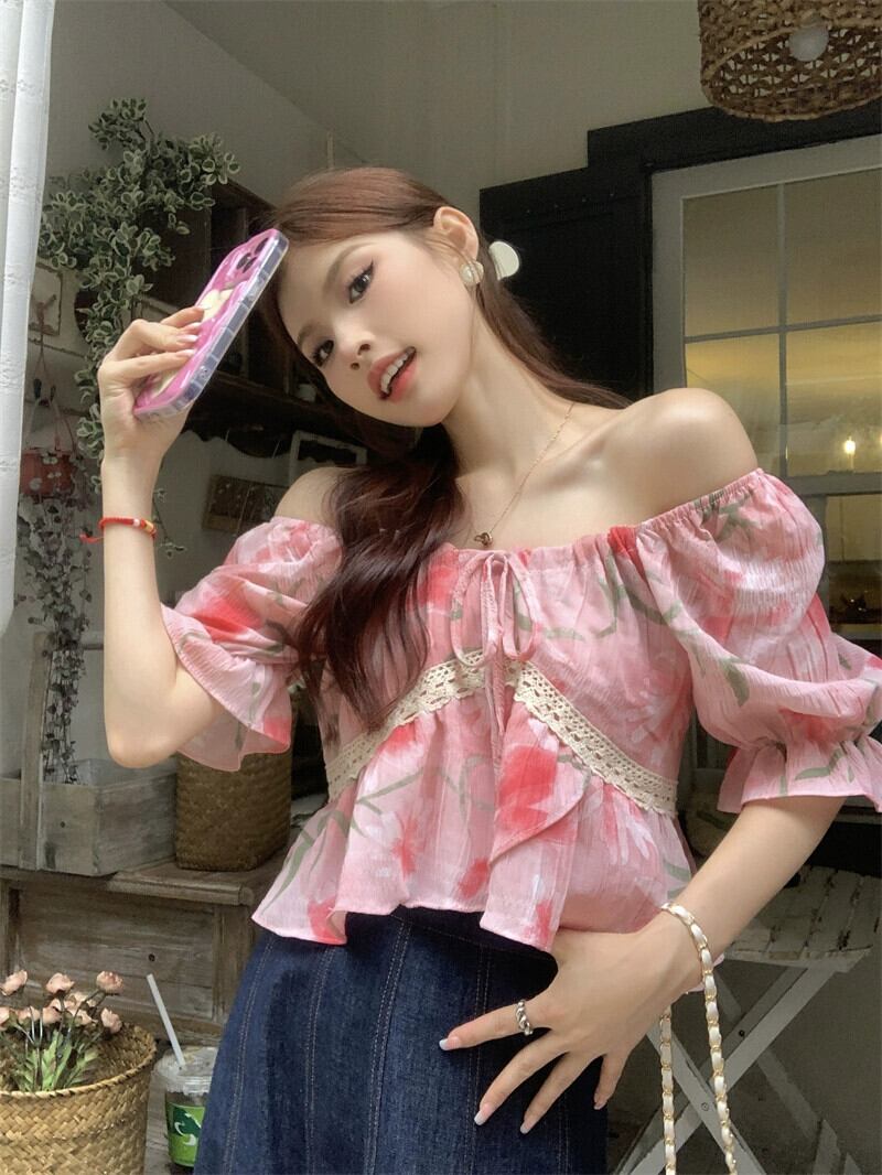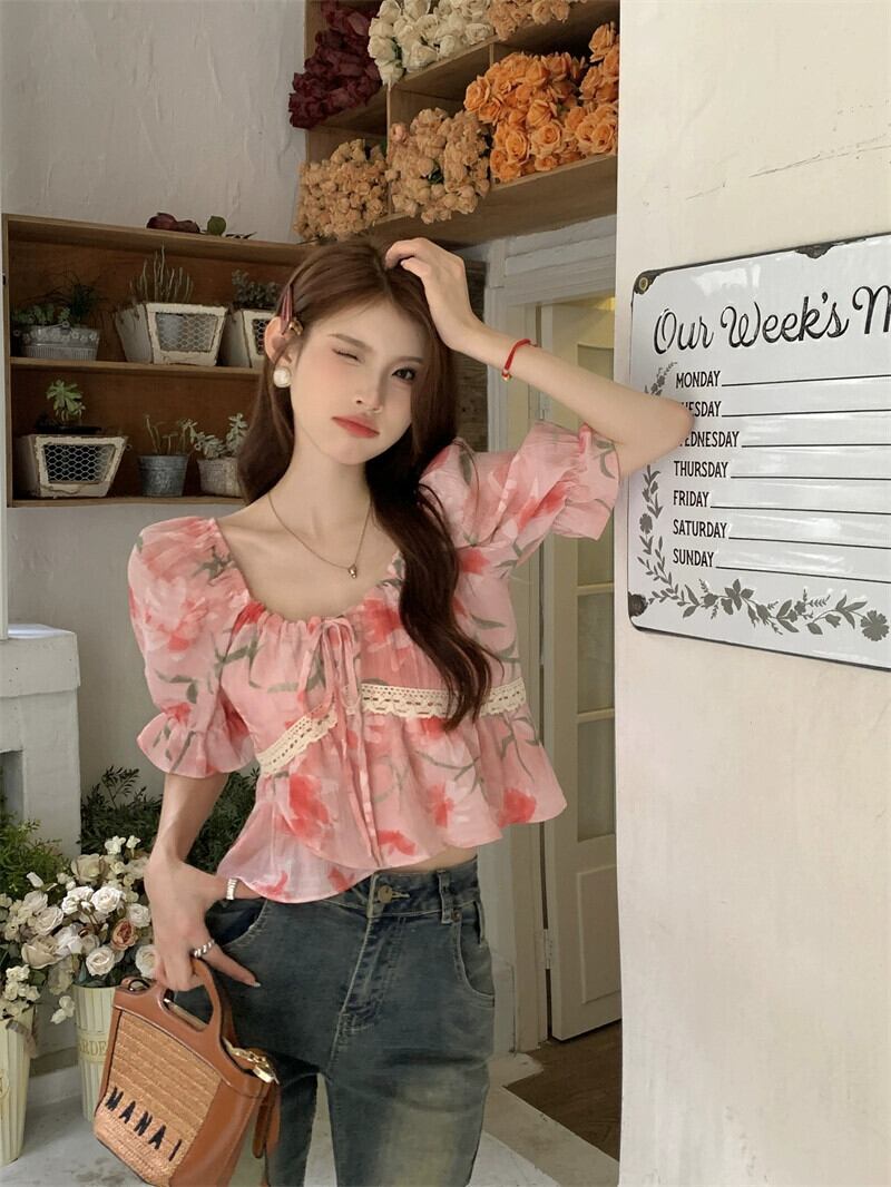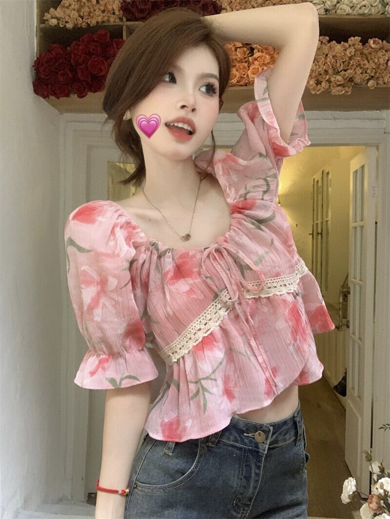 優しい風スクエアカラー半袖シャツレディース 2023 夏の新作甘いフレンチ花柄ネクタイショートスリムトップ 大人ガーリー スウィート キュート カジュアル サマー 夏物 スクウェア missk28837685247