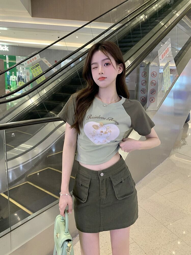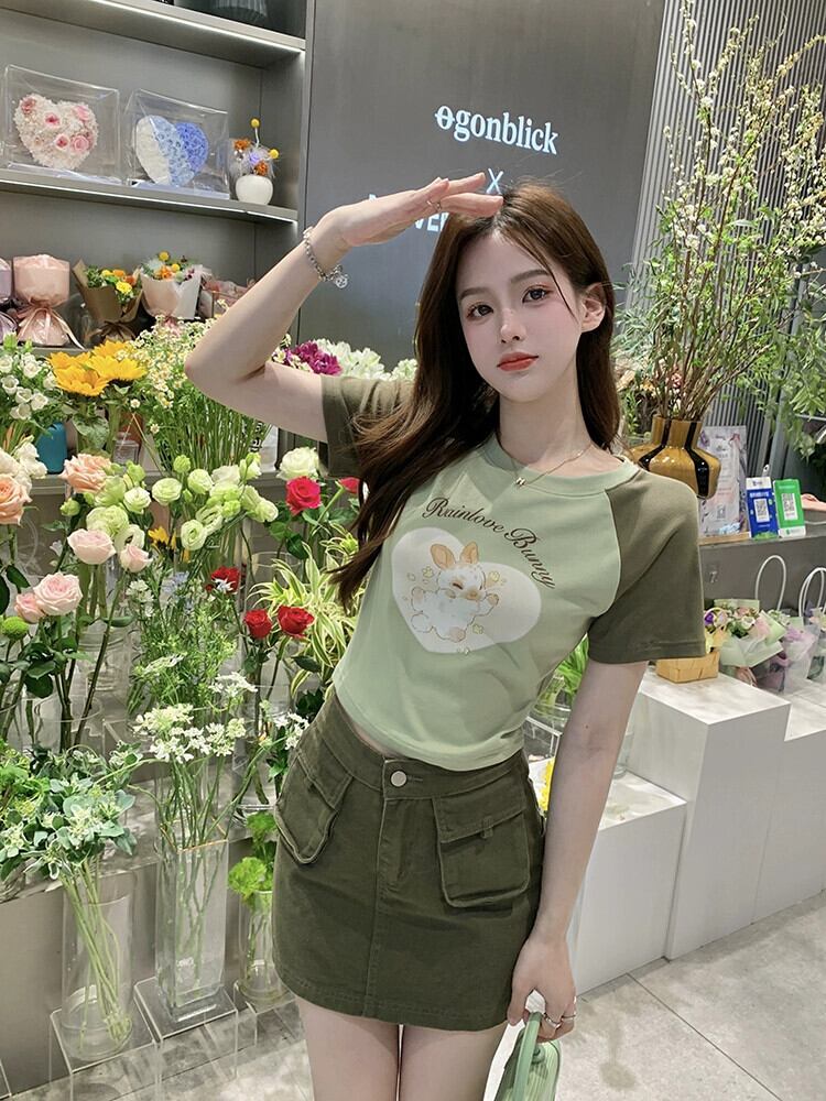 ラグランスリーブ配色半袖Tシャツ2023夏新作スイートラブプリントスリムフィットショートトップイン 大人ガーリー スウィート キュート カジュアル サマー 夏物 missk64551631878