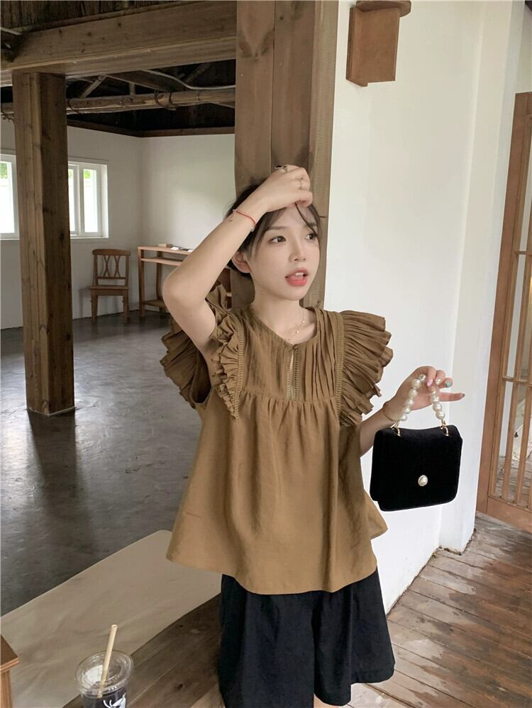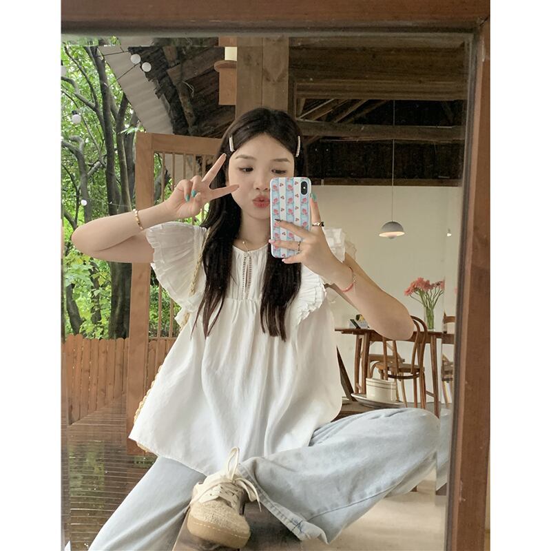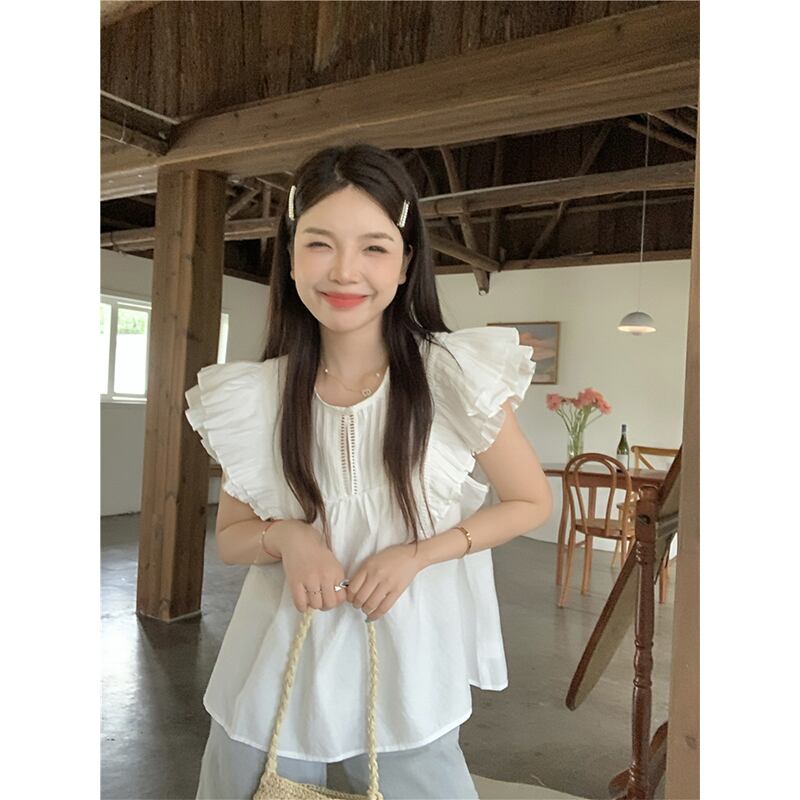 西洋風小さなフライングスリーブデザイン年齢軽減シャツ夏甘い中空木の耳シャーリングニッチトップトレンド 大人ガーリー スウィート キュート カジュアル サマー 夏物 missk94499726543