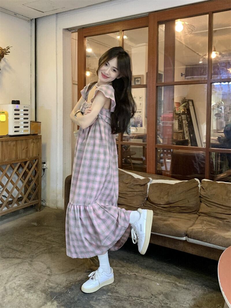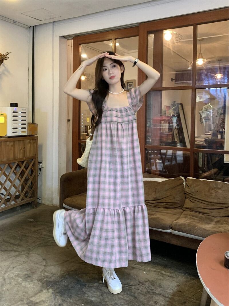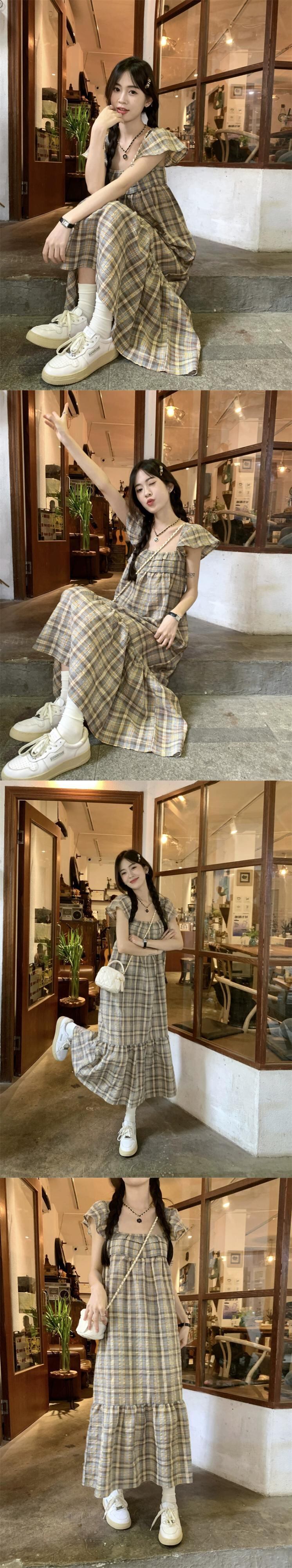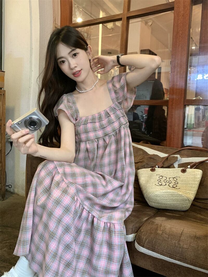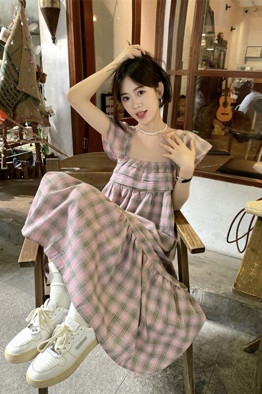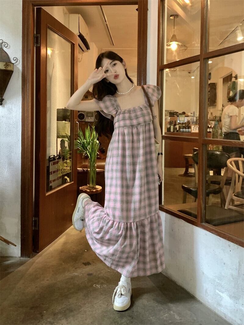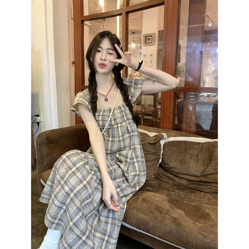 小さなフライングスリーブスクエアカラードレスの女性の夏 2023 新しいフレンチレトロチェック柄ウエスト痩身ミッドレングススカート サマー 夏物 スクウェア missk73839537158