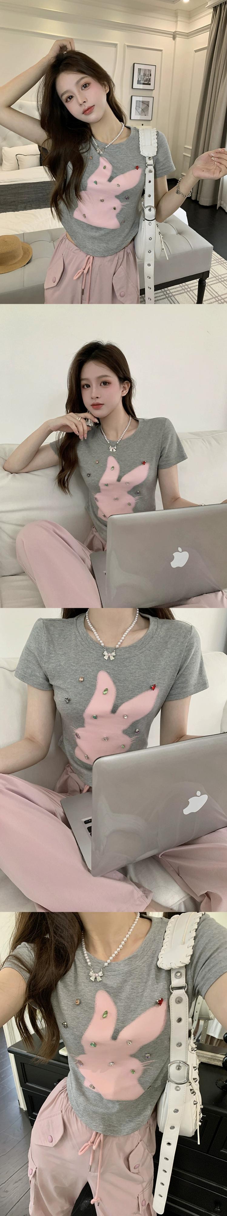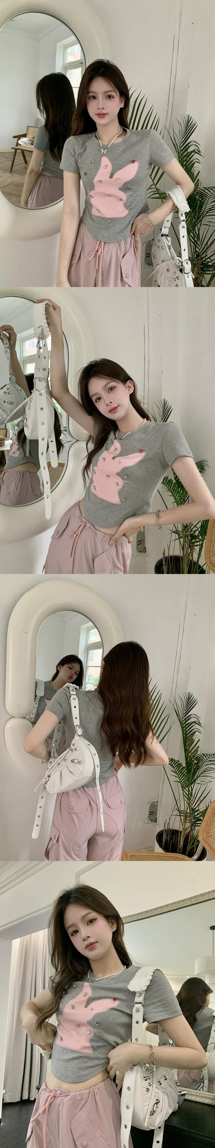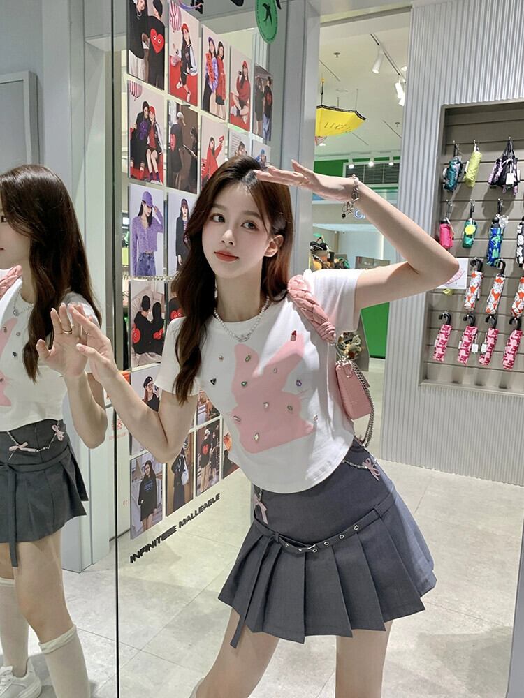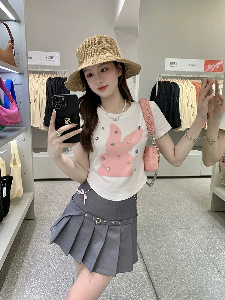 純粋な欲望フロントショルダー半袖 T シャツレディース 2023 夏の新しい甘いウサギのプリントスリムフィットと薄い不規則なトップ 大人ガーリー スウィート キュート カジュアル サマー 夏物 Tシャツ missk32049975471