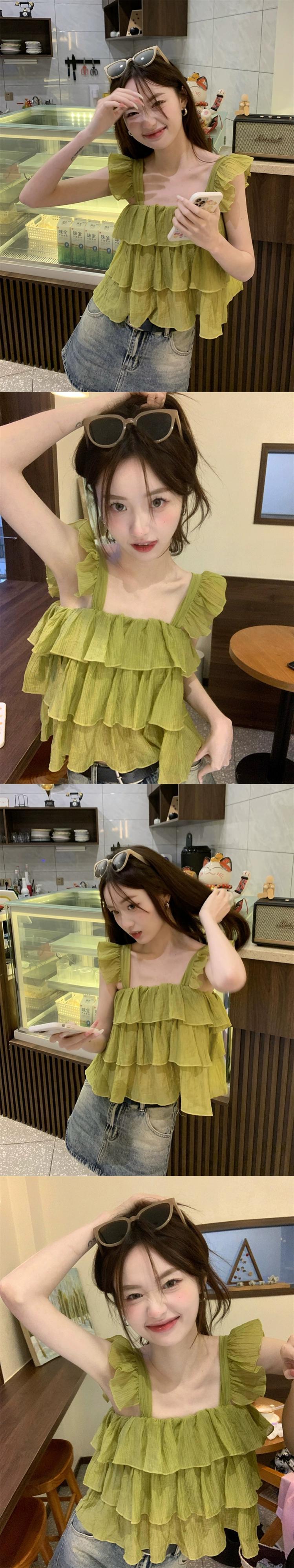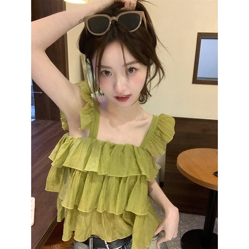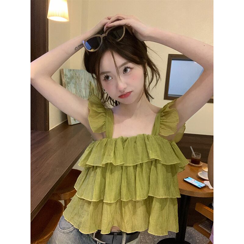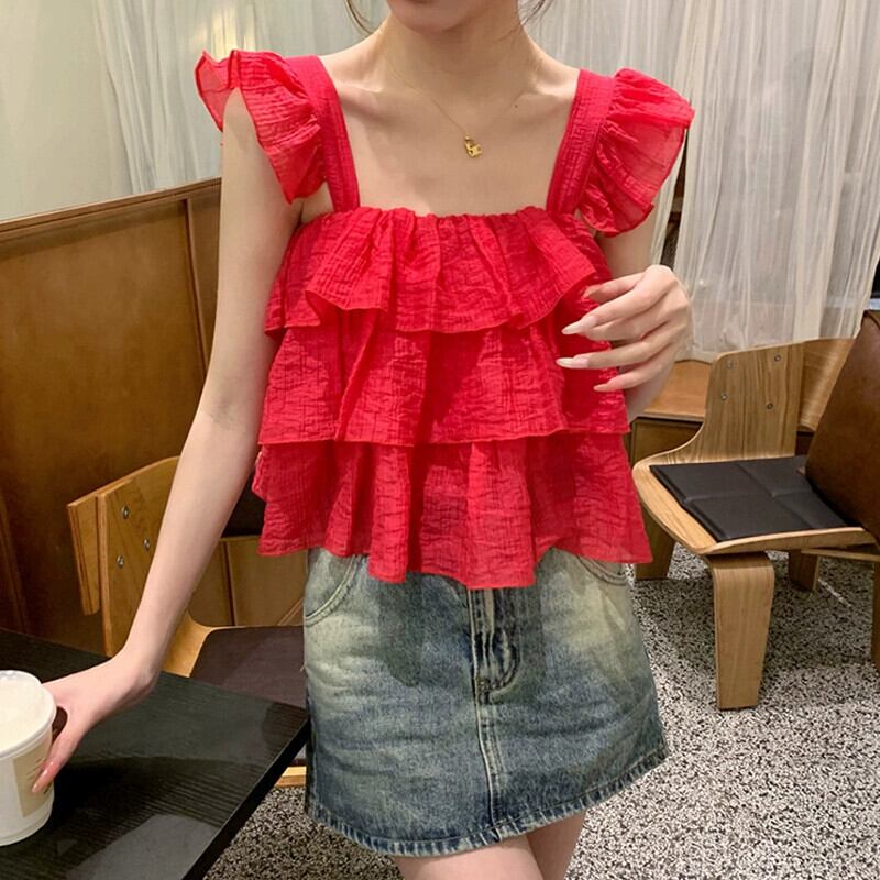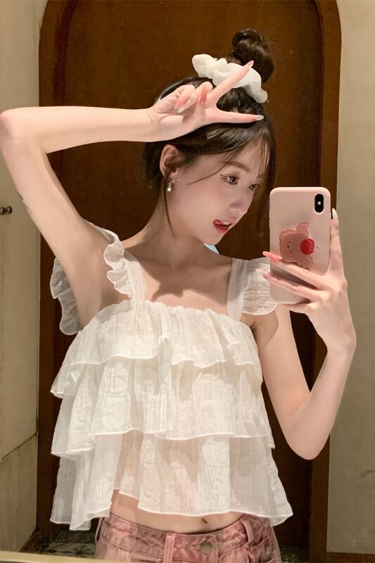 甘いスクエアカラーキャミソールレディース2023年夏新作フリル付きデザインは薄くて短いシックなシャツに見えます ショート ラッフル 大人ガーリー スウィート キュート カジュアル サマー 夏物 スクウェア missk57604134795
