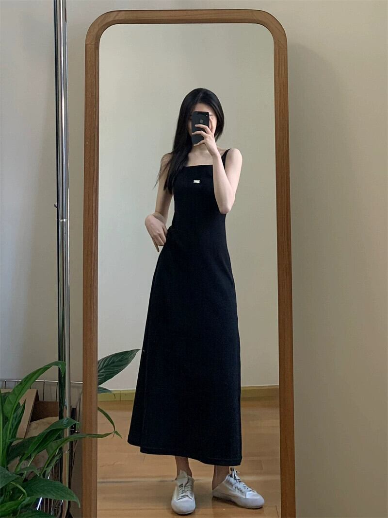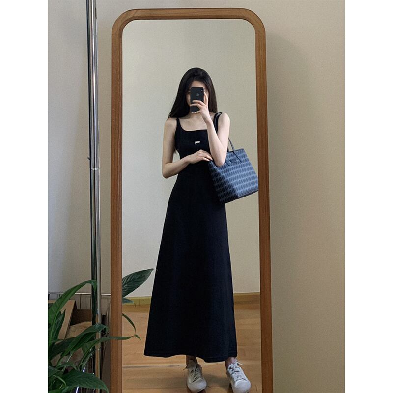サスペンダードレスの女性の 2023 夏の新しいスタイルのシックなミッドレングスウエスト痩身ブラックヘップバーンスカート サマー 夏物 missk11753475348