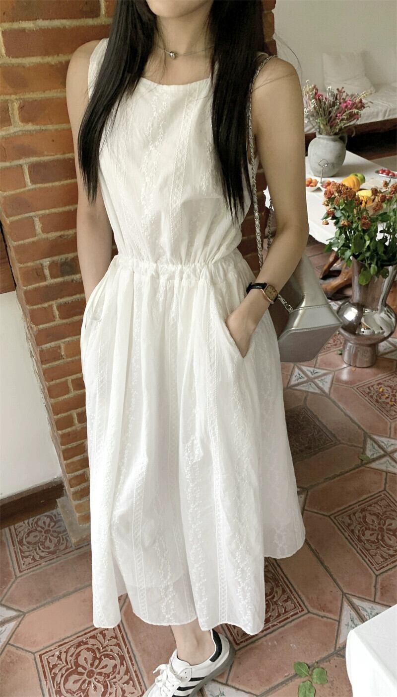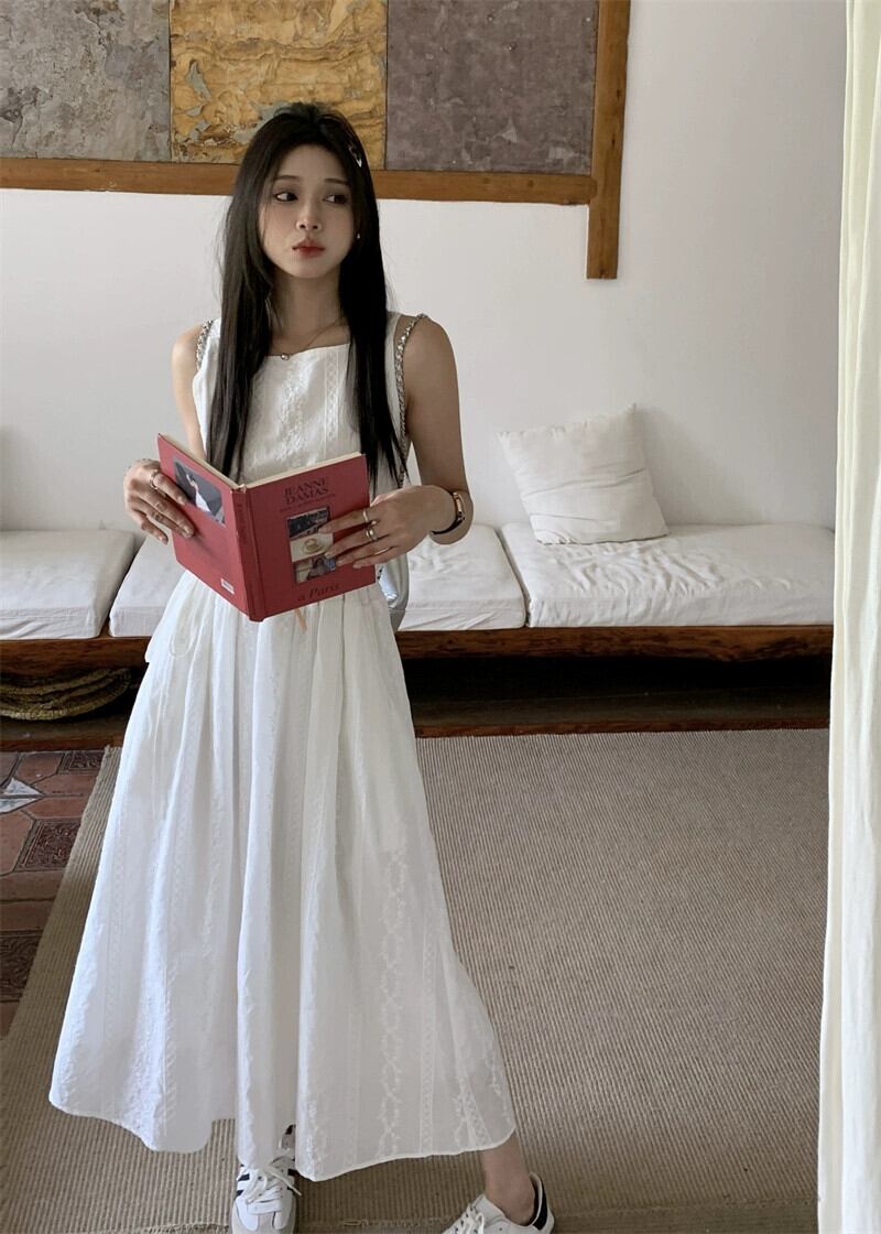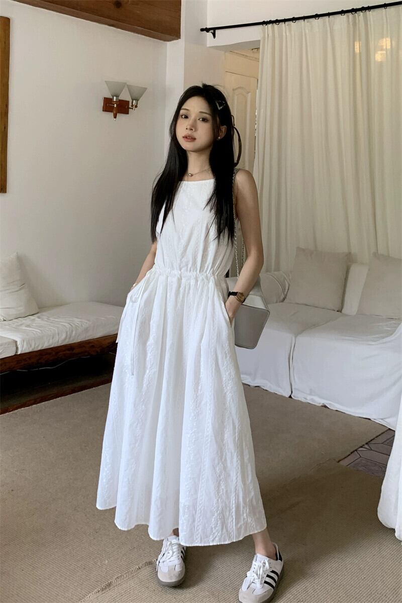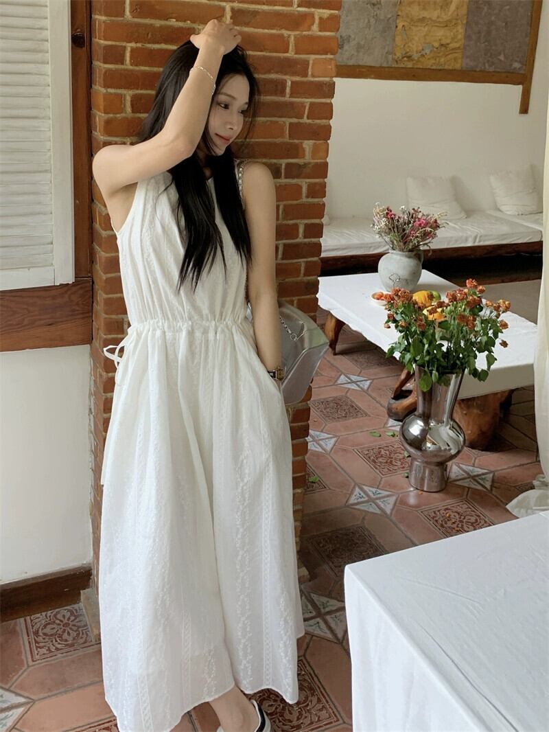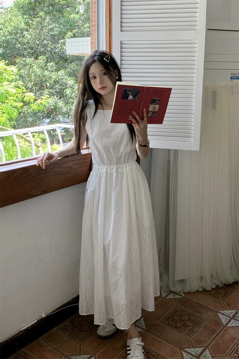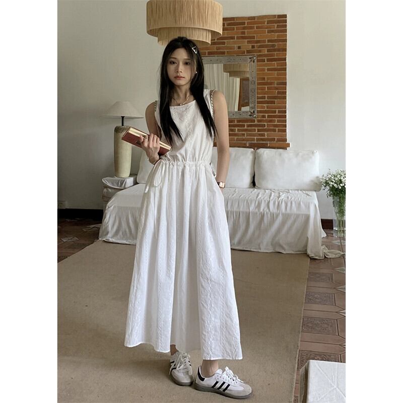 夏の 2023 新しい巾着ウエスト痩身シンプルな白の刺繍スクエアカラープリーツノースリーブベストドレス女性 ホワイト サマー 夏物 スクウェア missk40952847263